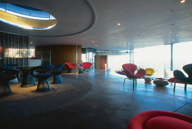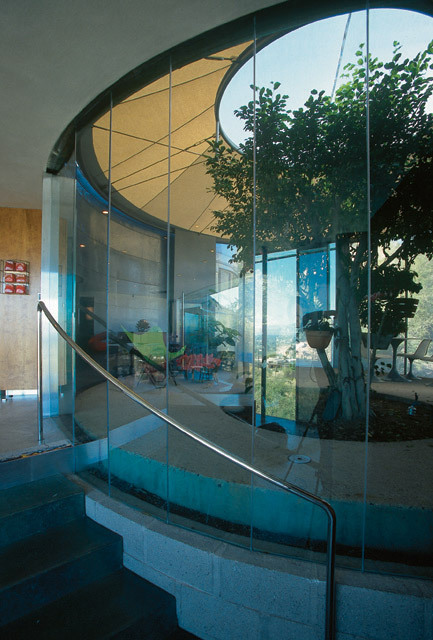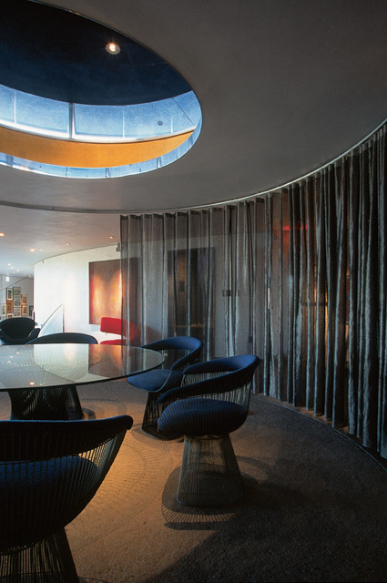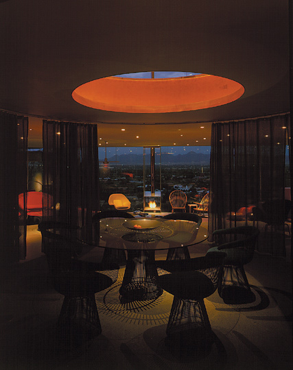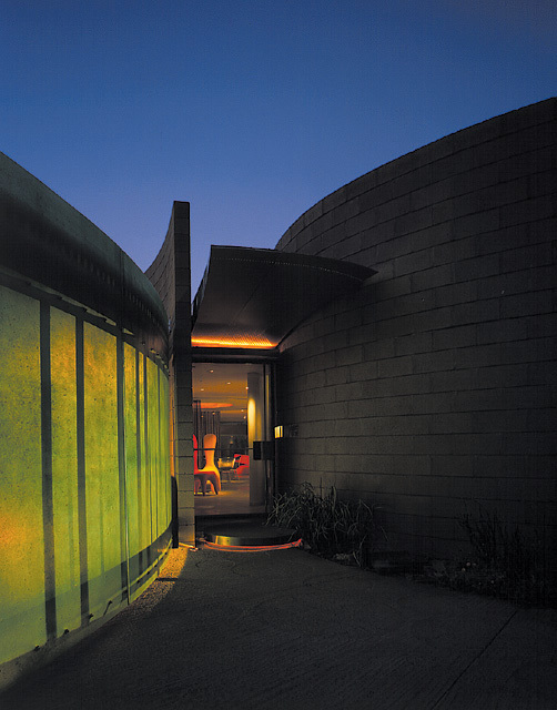 Designed to accommodate a casual Arizona lifestyle that emphasizes indoor/outdoor relationships, as well as a showcase for extensive art and modern furniture collections, the design incorporates five intertwined circles and crisp, curvilinear geometry. Screened from the street, the approach to the home features a canyon-like space that echoes the surrounding natural mountain forms. Visitors enter through an impressive 7’6” pivoting glass door under a custom aluminum canopy. Once inside, the curving concrete masonry opens to reveal dramatic and impressive distant views and a commanding panorama of Paradise Valley to the north.