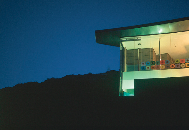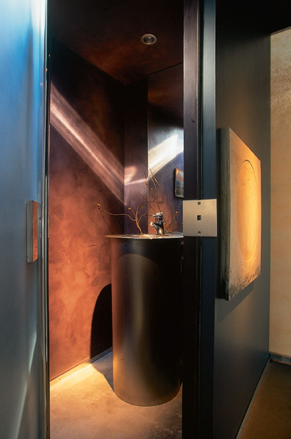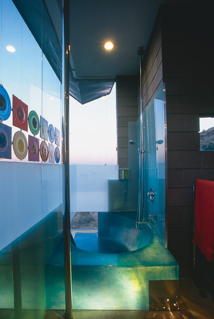 Sculpted processional of interior wall forms draw the eye through an ever-changing series of interior volumes, ending in a 310’ arc of glass. A dance of natural light floats in and out of the spaces, assisted by dozens of strategically placed glass and resin window squares enhancing subtle and unique view vignettes. Interior walls are further enhanced with hand applied smooth reflective plasters.
