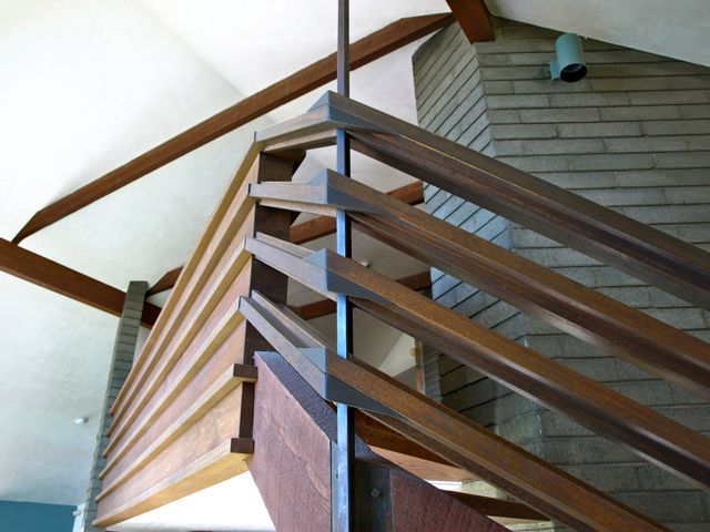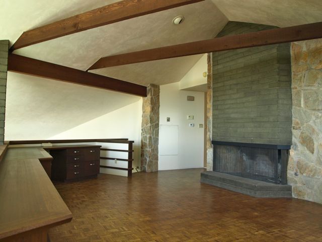 The interiors include a soaring vaulted ceiling and exposed natural site quarried stone walls. Millwork and details are an unspoiled architectural expression that reflects the Modern Organic ethic of this creative Architect.