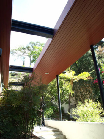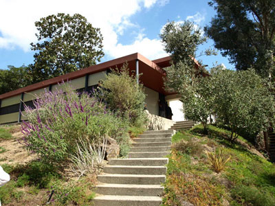 Built of steel, glass, and resin bonded maritime grade plywood, the Schrage House was constructed concurrently with Soriano’s influential Case Study House and is the last of his 1950s houses to use to 10 x 24 modular steel frame. Soriano’s trademark one=story pavilion form is translated to a hillside setting by placing the two-car garage at the lower street level and concentration the broad and low living space above.
