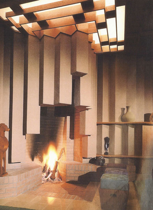 Taliesin Architects – the Focus House at Taliesin Gates represented a crowning design for one of the most recognized and talented architectural groups in the world. Built as a showcase for the talents of the firm and principally designed by Taliesin Fellow, William Wesley Peters, this home is the result of a lifetime of intimate study at the side of Frank Lloyd Wright. From the innovative textural walls to the beautifully executed Philippine Mahogany wood paneling and details