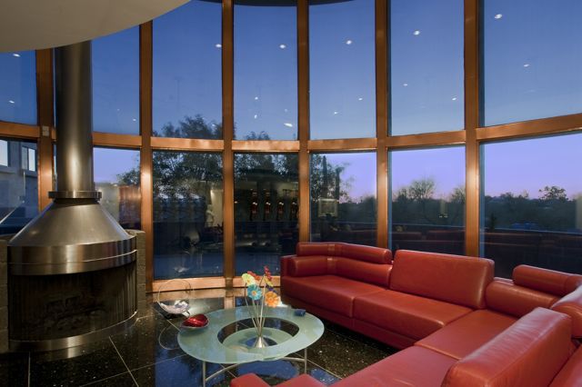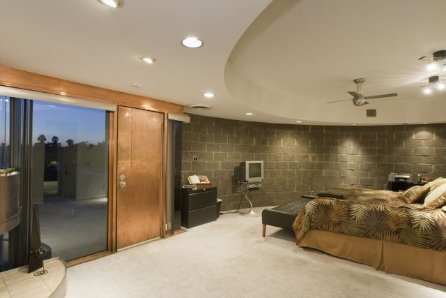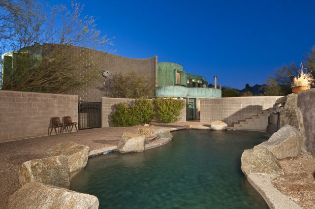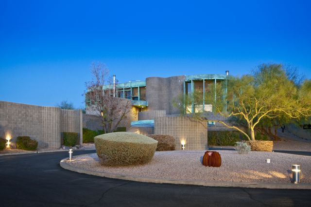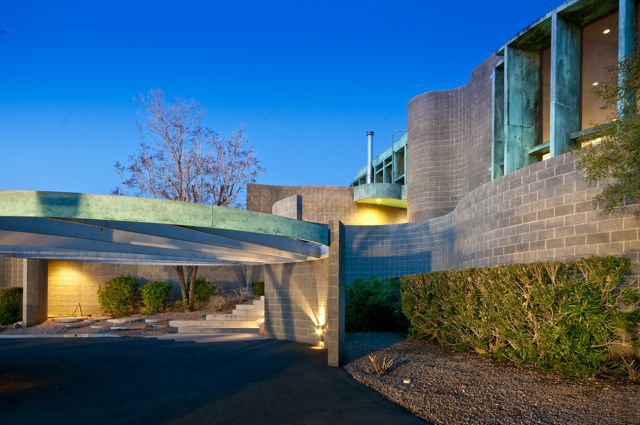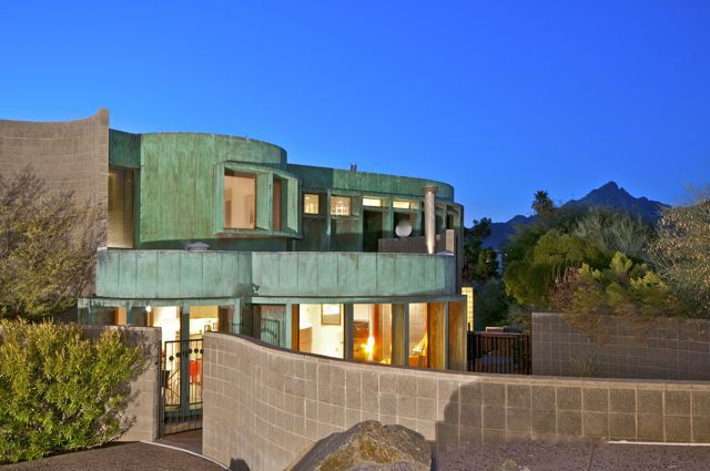 Originally designed by Architect William P. Bruder, this organic plan offers contemporary living in one of the most architecturally interesting areas of all Phoenix! Extensive use of copper over concrete block that gives this home a unique detail signature. Light-filled interiors and a generous floorplan that includes over 4700 square feet, 4 bedrooms including generous attached guest quarters, 5-car garage and large studio/store-room.This unique curvilinear design allows for sweeping views and sensuous walls.  Inside diffused natural light floods the interiors while floor-to-ceiling windows add to the drama.  THREE Signature Bruder fireplaces remain.  There are several private patios, pool and spa.  There have been several renovations to the original plan and design.