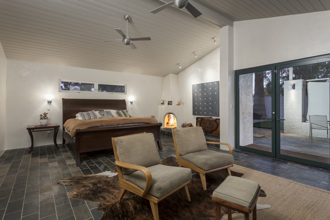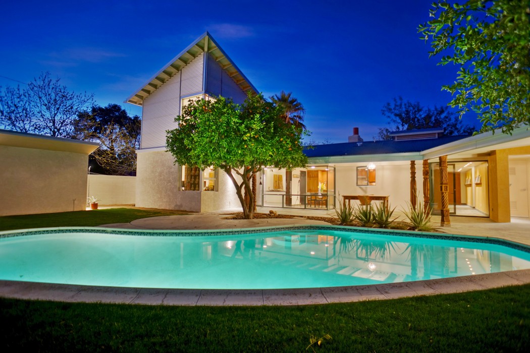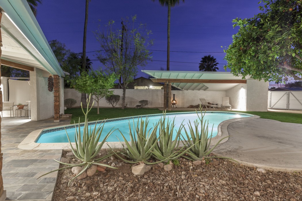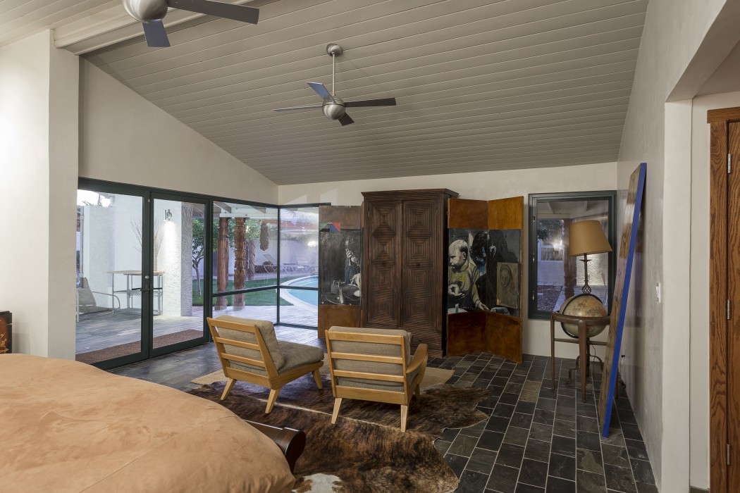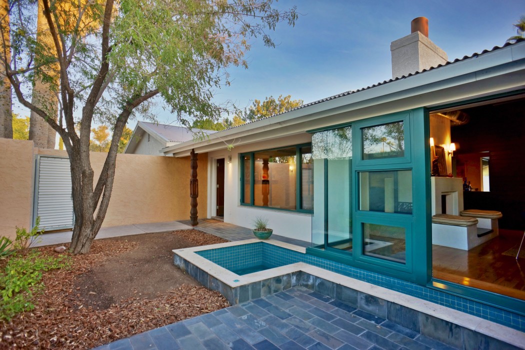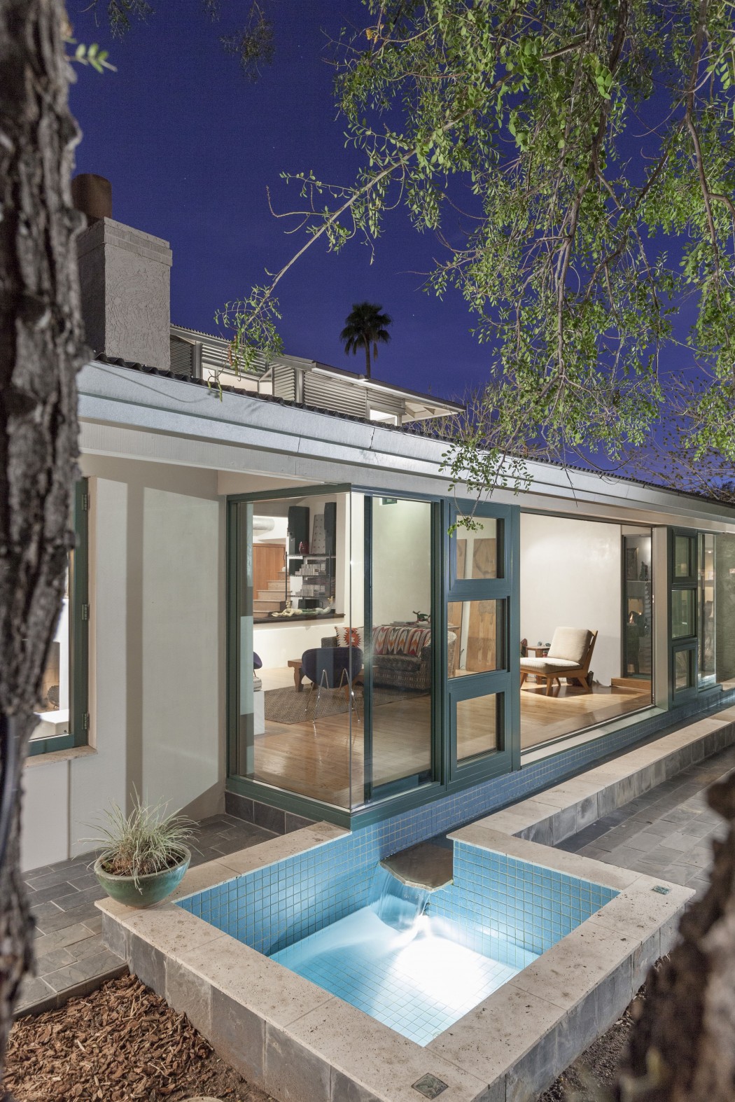 This Arcadia-area modern ranch home has been crafted by the architect/owners to offer an ultimate expression of Arizona Living. WIth it’s private courtyard entry creating an inviting entry, the vibe is irresistible. You are greeted with formal dining and a large, two-way fireplace to anchor the home firmly to the site. The Family room opens completely to the front court, allowing the soothing water feature to wash the entire space with calm. Hand plastered walls, paneled walls and ceilings, and beautiful hand-cut stone and select wood floors show the complete attention to details that sets this home apart from all others. Natural light is balanced throughout the home and each space remains unique. The Split master suite offers a generous sitting and dressing area, vaulted ceilings and the “Rumford” style corner fireplace add to the subtle elegance. The en-suite bath offers a generous shower and freestanding tub. An outdoor shower allows natural interaction with the exteriors complete with private patios. A deep and generous covered patio, sparkling pool, lush green turf lawn and separate covered pool veranda make for a cool respite in even the hottest of days.