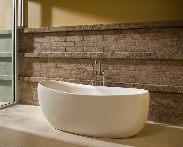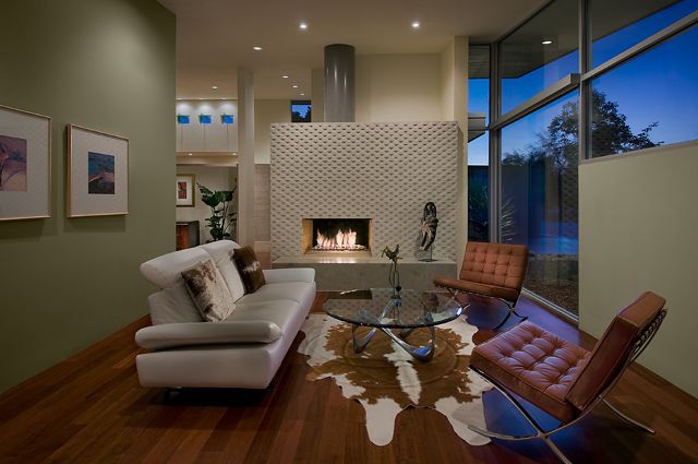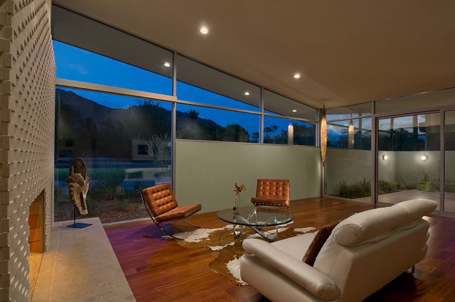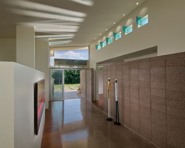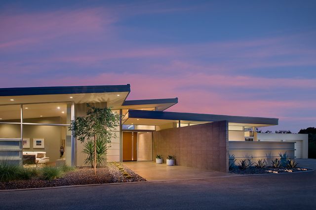 A single-pitch metal roof over the main living/entertainment areas, is flanked by “floating-roofs” over the two zoned bedroom wings. The curved architectural-masonry wall leads from the driveway, through the striking 30-foot-long gallery entry, then exits to the back yard through a telescoping wall of glass: Interior and exterior living spaces become one.