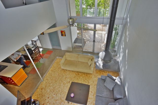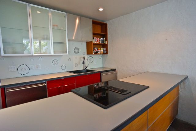 This home has been seriously renovated to include updated, glazing, doors, kitchen and baths. The mill-finish aluminum door and windows offer a chic modern vibe that couples with efficiency. Inside you’ll find Glass mosaic tile in the baths, decorator fixtures and sinks, and separate soaking tub and shower in the Master. The floors are finished concrete, designer carpet upstairs and a eco-chic sanded OSB wood insert in the living room for a touch of warmth.