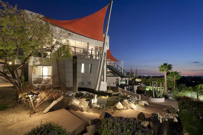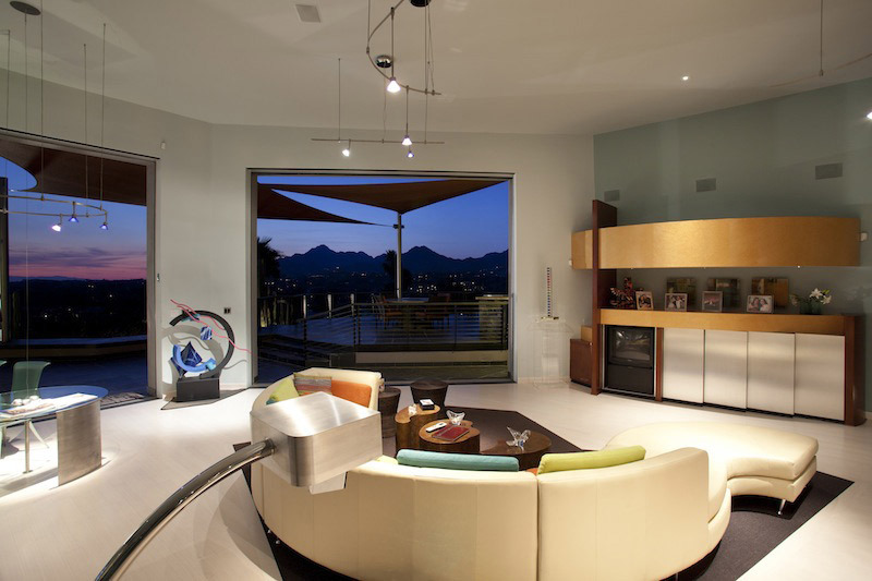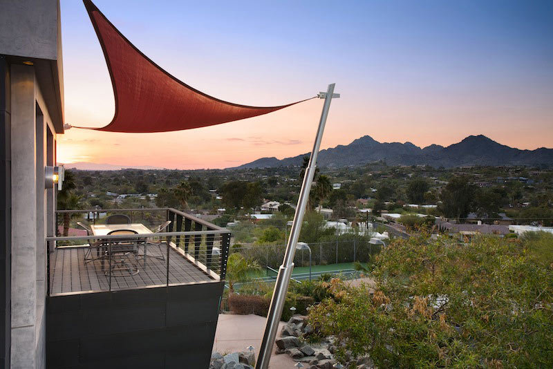 Featuring exterior Architecture of muted tones and strict, hard line geometry this home couples interior spaces designed to highlight the expressive and playful art collection. The exterior material palette is smooth plaster and darkened zinc panels with accents of stainless steel and perforated steel. The design crescendo is a 30 foot tall, stainless steel mast supporting the expansion and viewing deck which offers this home dramatic views of Paradise Valley and beyond from it’s northern exposure. The suggestion of rusted-red fabric awning completes a subtle nautical reference and offers a wealth of shade and comfort.