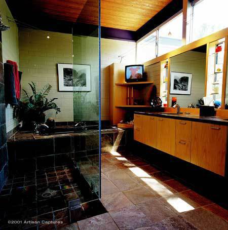 The home is completely updated throughout including a stunning kitchen featuring maple cabinets, stainless steel details and appliances, granite counters and large work surfaces. The master bathroom has a large shower detailed in natural slate, steel sinks and cast concrete counters. This home has a fabulous and spacious library/office addition by Architect William P. Bruder that integrates seamlessly with the space.
