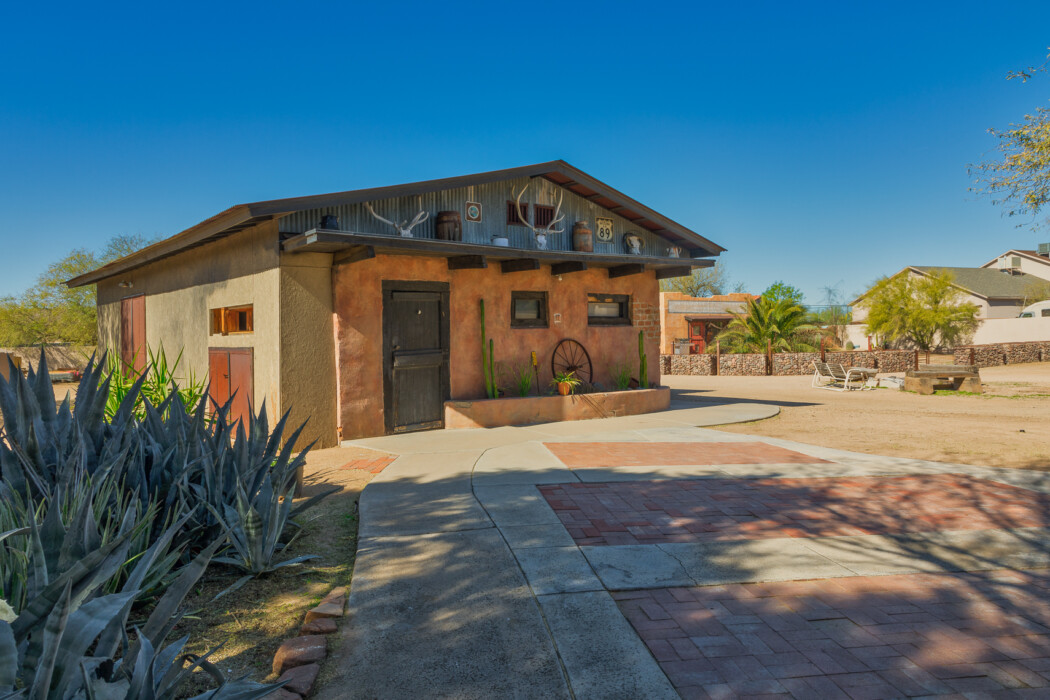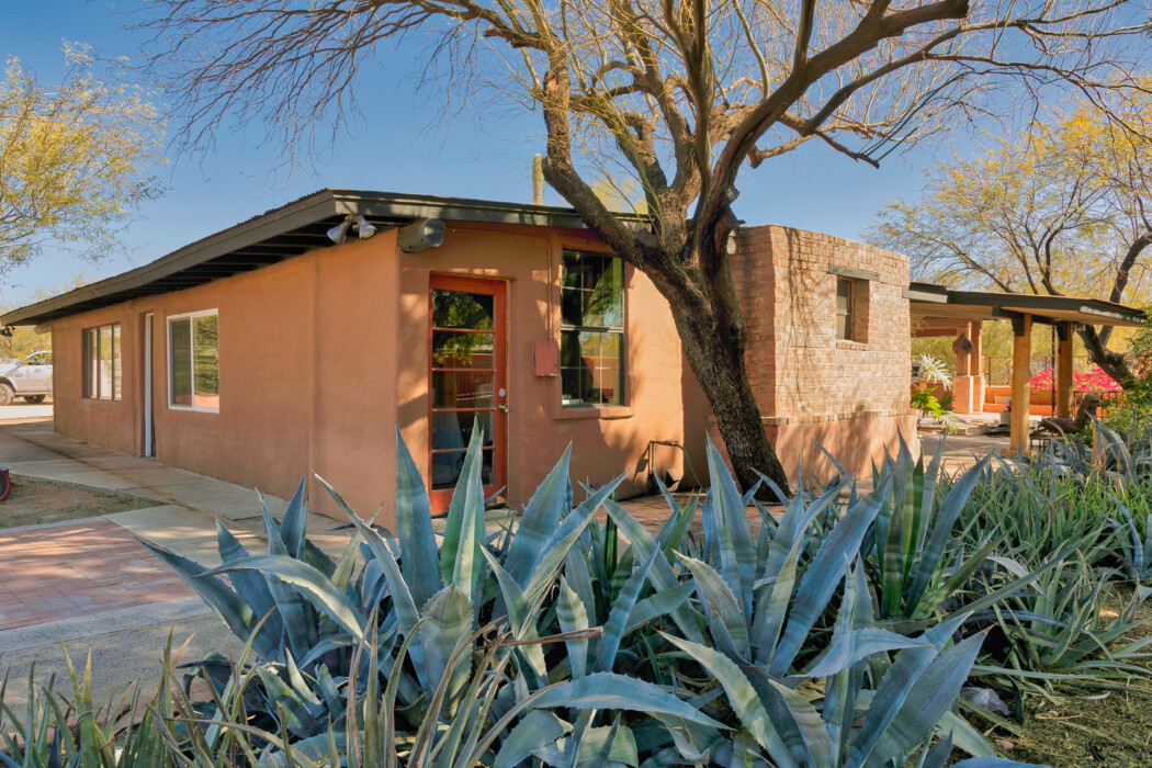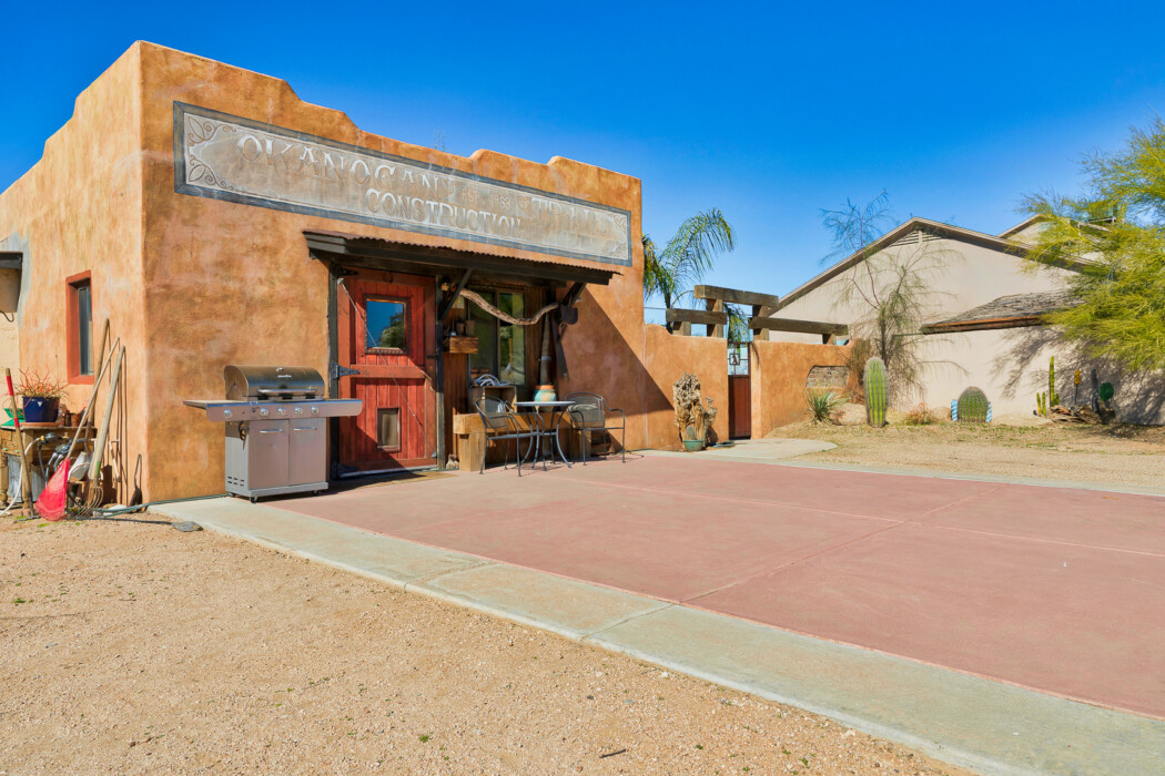 The third structure with livable space was originally the barn on the property. A concrete block Santa Fe style building in the back of the property, the barn had been converted to design studio. With a large 5’x11’ island counter and surrounding shelving, lots of workspace abounds. The current owner added a separate full bathroom and bedroom to this space.