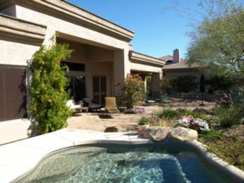 Thermador appliances, custom paint, furniture-grade cabinets, added lighting, and much more! Super large N/S lot backs to pristine desert NAOS with view fencing, plus built in BBQ center, Professional Landscape, heated rock spool, water pond complete with Koi fish and a huge patio for sunset gazing. Terravita clubhouse features all types of activities: exercise, restaurant, heated pool and spa and much more!