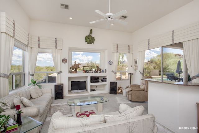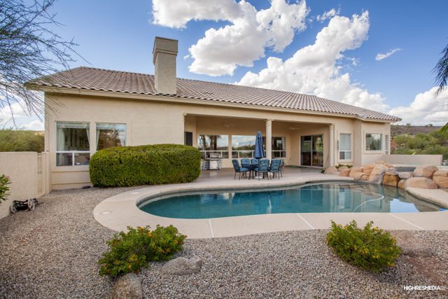 Amazing Views in all directions….This stunning home sits on just over an acre. You will not want to leave your own private resort in the desert. This open floor plan is perfect for entertaining. 3 large bedrooms with an office/den. The Den/library has built in custom shelving. Enjoy your master suite with a fireplace overlooking the sparkling heated pebbletec pool and spa with 4 Peaks as your back drop!