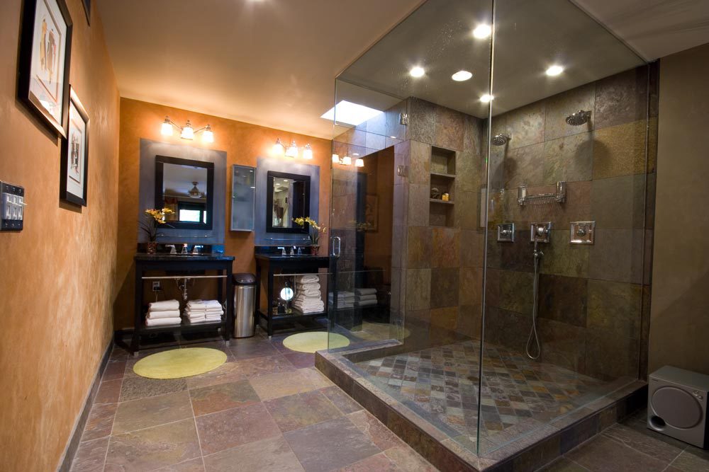 Resort worthy outdoor shower & 30′ mtn. wall