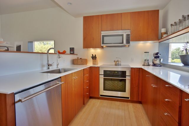 Ground floor offers gated carport parking to two cars, a chic and versatile flex space perfect for home office, shop or study, and replete with it’s own A/C for maximum efficiency. The Second floor keeps all the living essentials in one place while maximizing a perfect balance of light and views. Kitchen, Dining, Living and half bath are filled with great light and a walk out terrace for outdoor living. Upstairs you’ll find two generous bedrooms and baths, the master offering dual sinks and large closet with full walk-in shower.