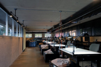 This Arizona studio is a renovated 1960’s mid century modern concrete building in the heart of down town Phoenix. A unique open studio, designed by DREWETT + BRENDEN ARCHITECTURE makes for a very special work place. The space offers ample light, concrete walls, concrete floors, beautiful landscaping.
