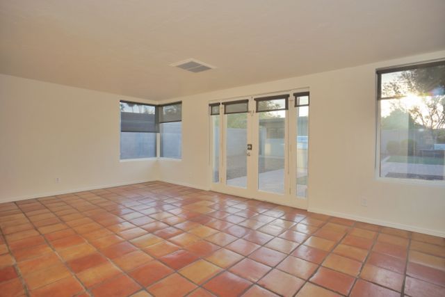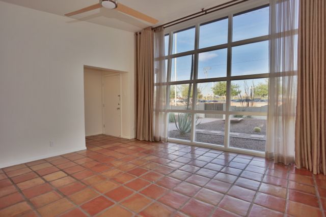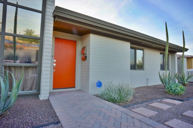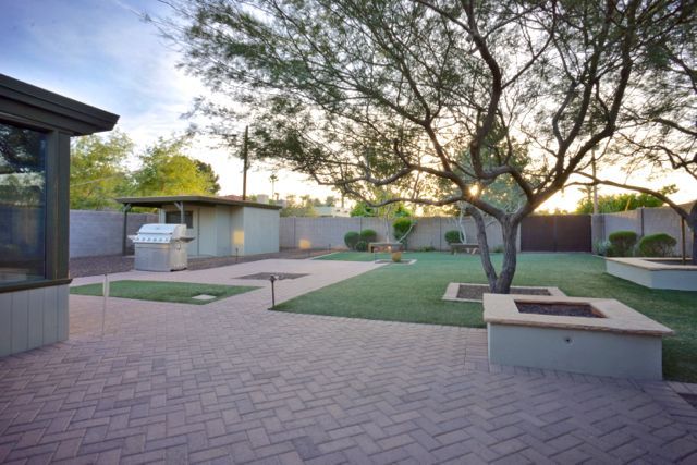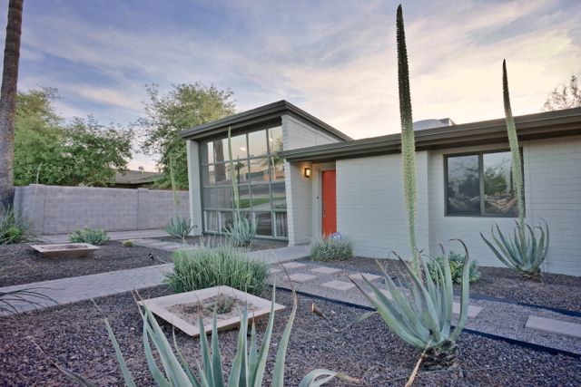 Unique Mid-Century Modern for Lease! This head-turning North Encanto Historical District Home is offered for Lease and won’t stay on the market for very long. Featuring unique and dramatic architecture which lends to intrigue from the exterior and a grand view, floor to ceiling canted glass window of the Downtown Phoenix City Skyline and Mountains from the interior. It was known originally as ”the Sunshine House” and it garnered local press when it was unveiled in the 1950’s. An addition to the back of the house creates a large formal dining space that looks out to the well designed landscaped yard with large mature shade trees.