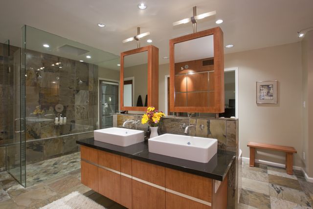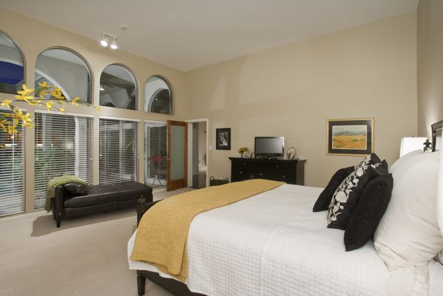 The master suite offers an award-winning bath design, replete with beautiful wood veneered closets and built ins. The large soaking tub soothes the soul: the large glassed shower and warm slate floor offers a spa-like experience.