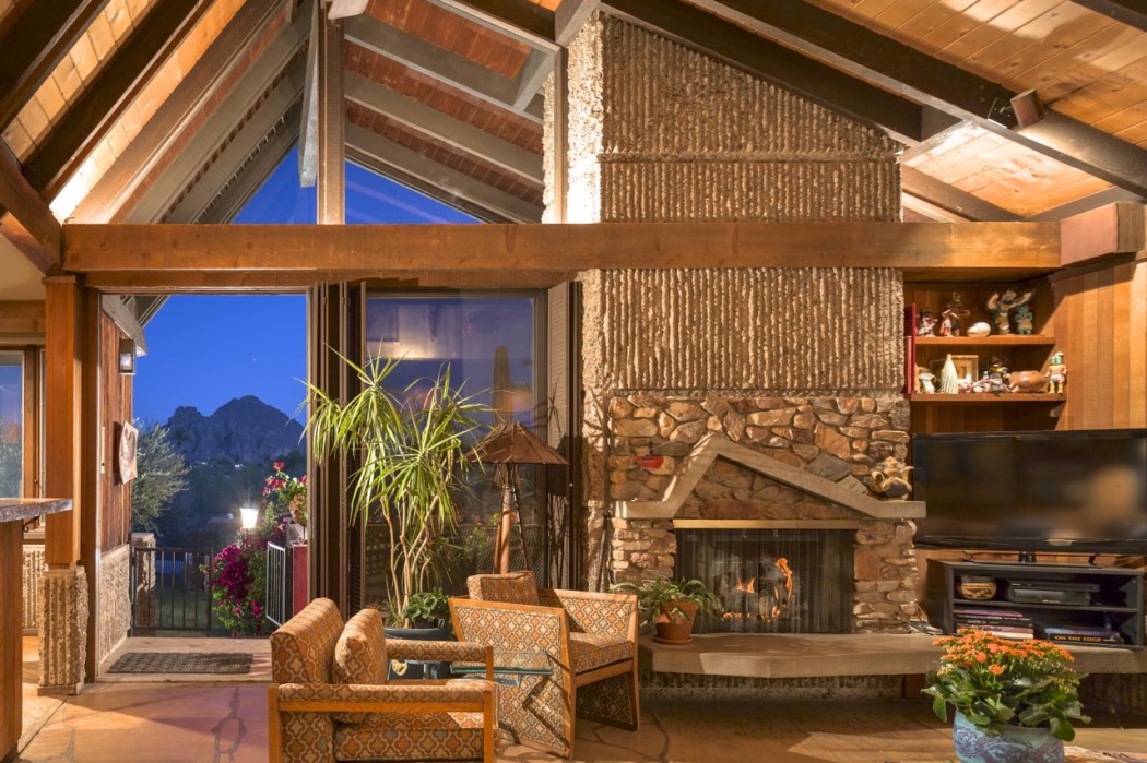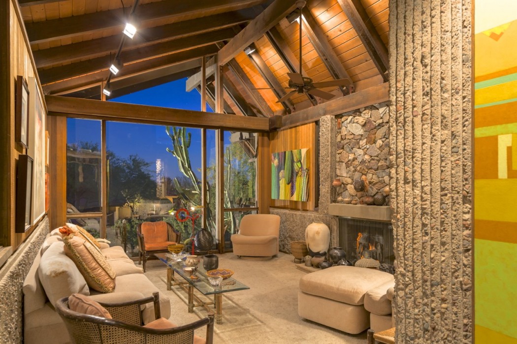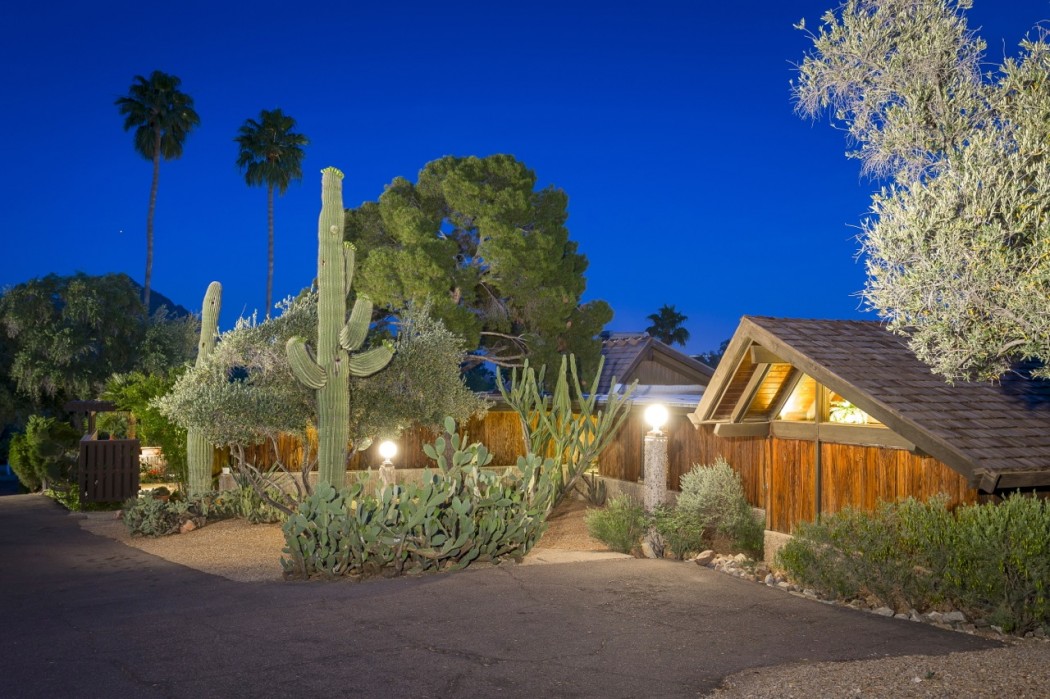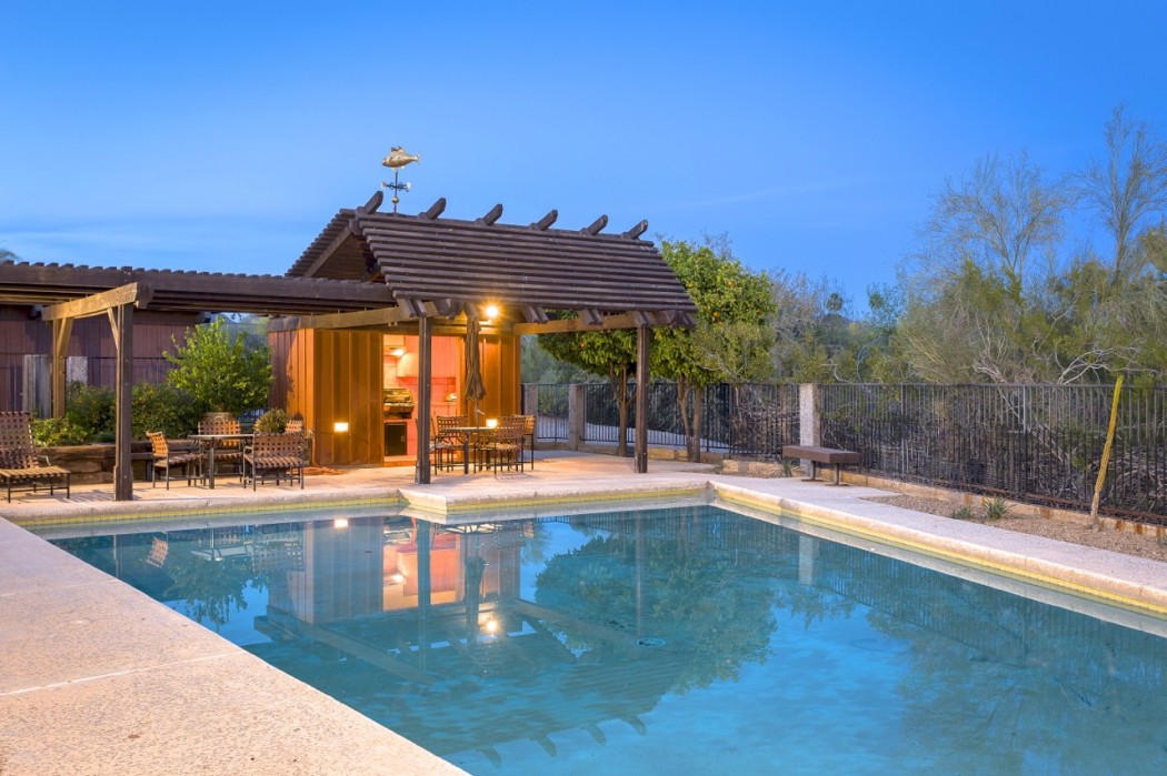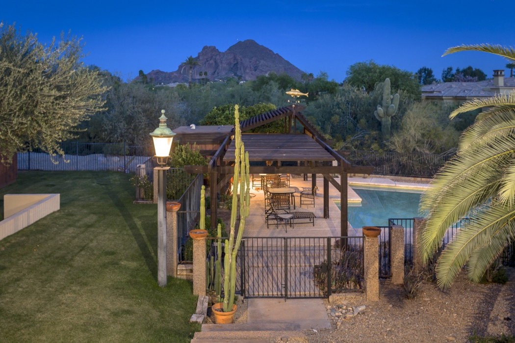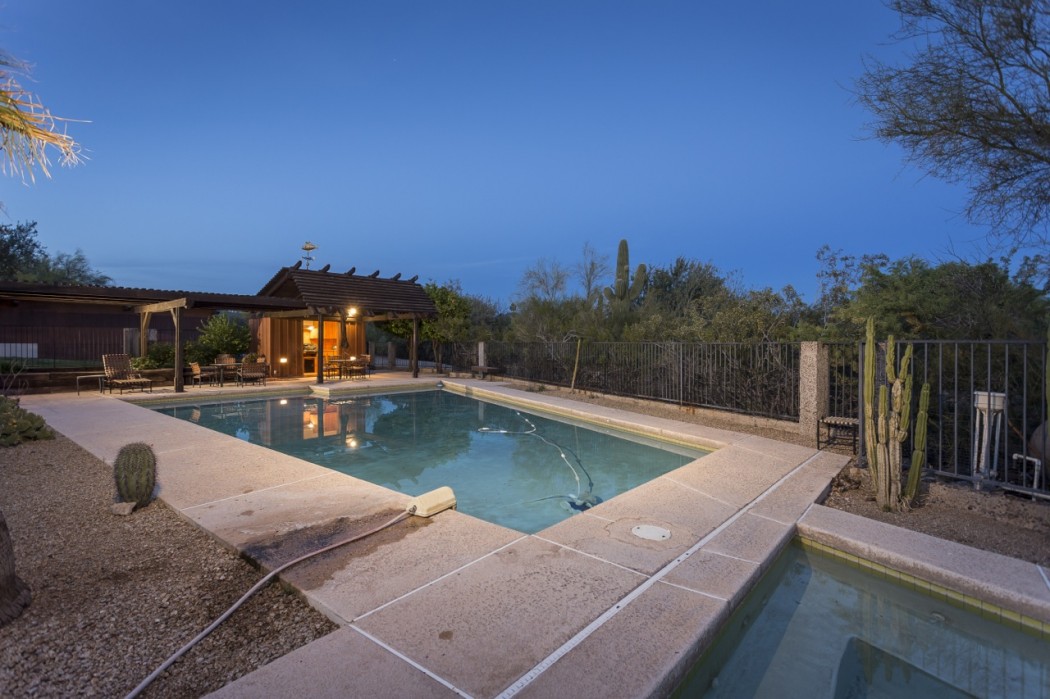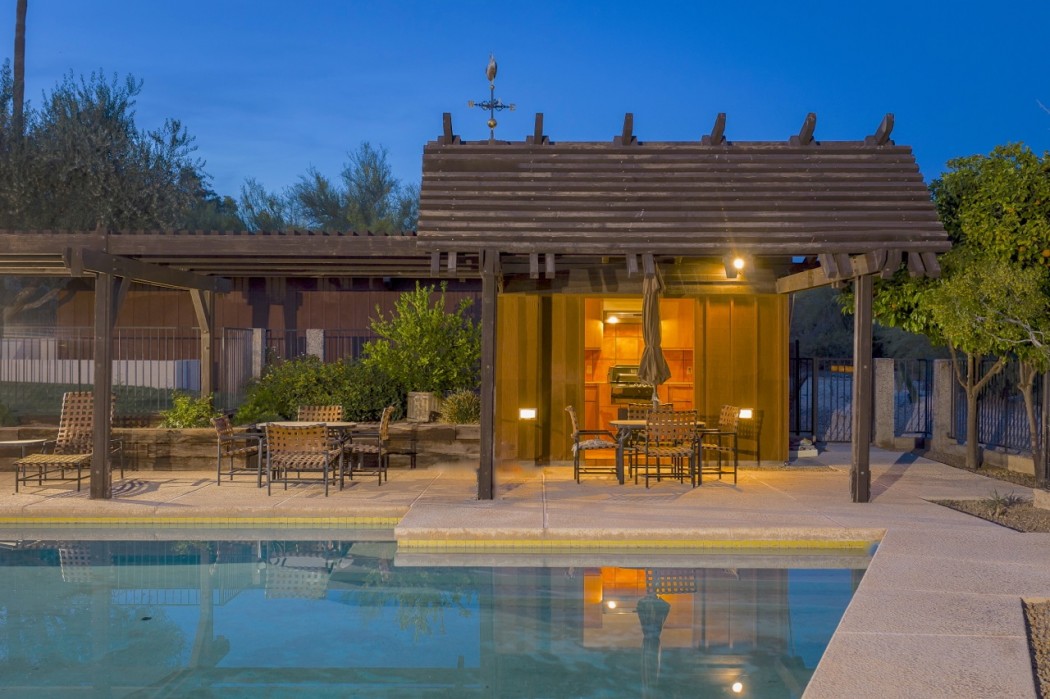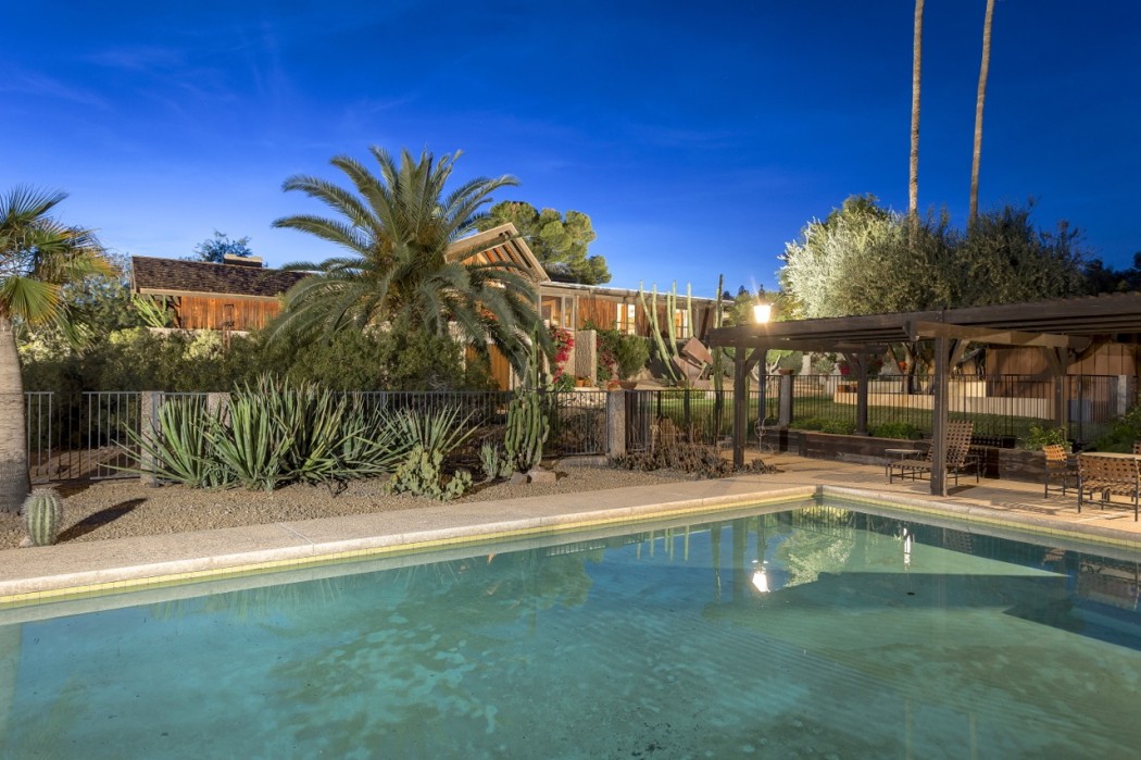 Vaulted ceilings and clerestory windows allow for a play of light throughout; flagstone and finished concrete floors provide natural warmth.  With three bedrooms plus attached guest suite, the property has a commanding view of Camelback Mountain as well city lights in the evening.   The pool and spa area includes an adjacent pergola and bath house and there’s three-car carport parking.