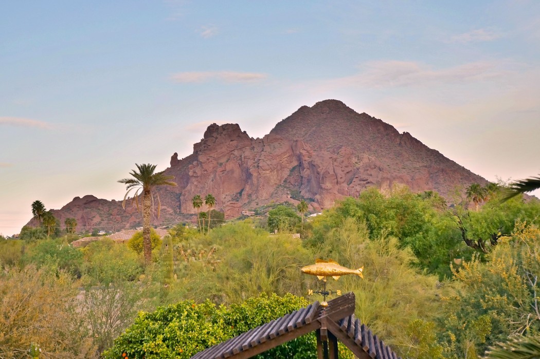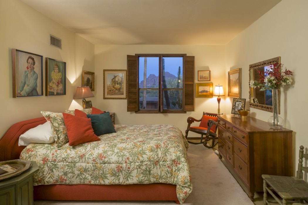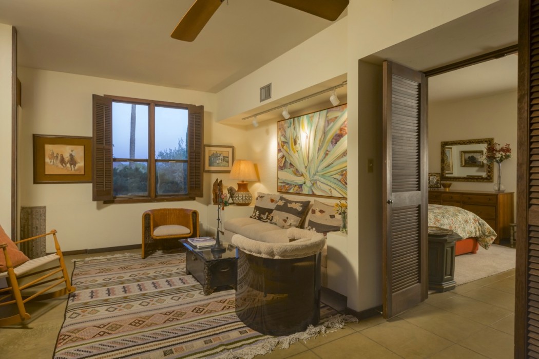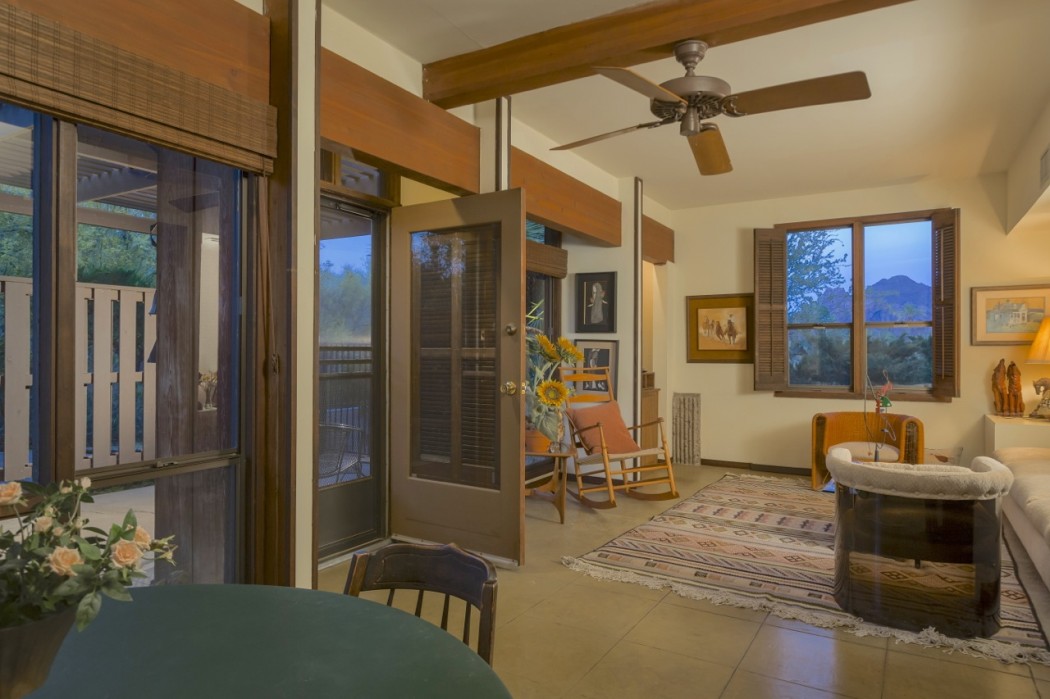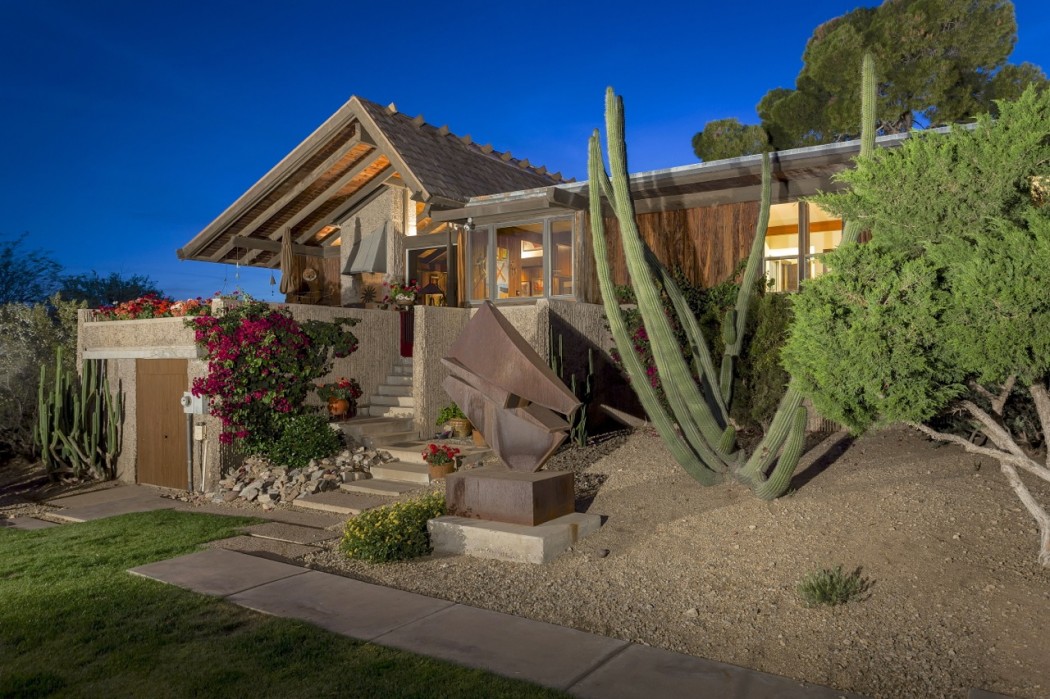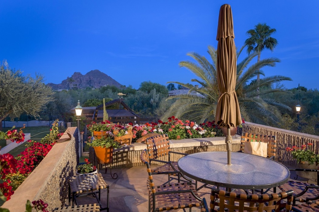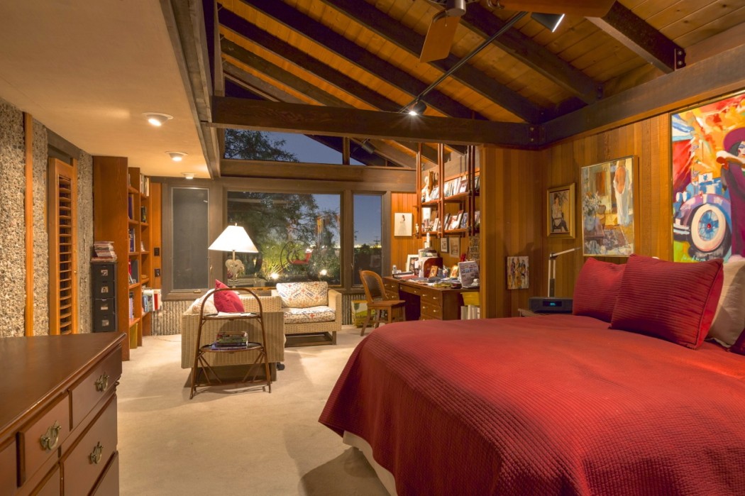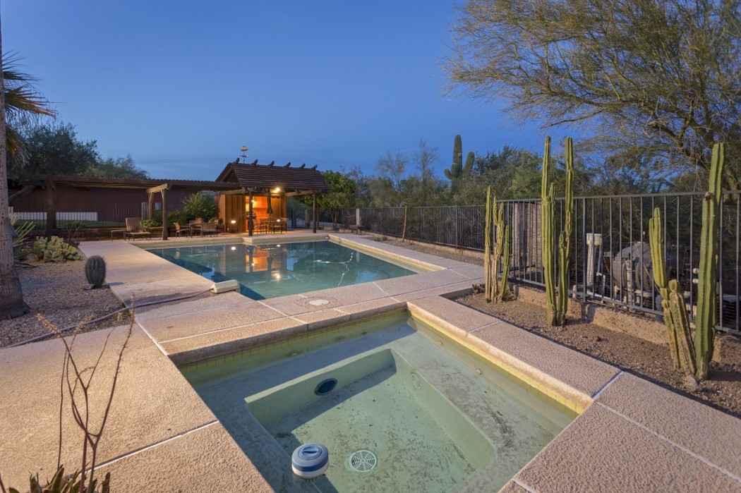 Vaulted ceilings and clerestory windows allow for a play of light throughout; flagstone and finished concrete floors provide natural warmth.  With three bedrooms plus attached guest suite, the property has a commanding view of Camelback Mountain as well city lights in the evening.   The pool and spa area includes an adjacent pergola and bath house and there’s three-car carport parking.