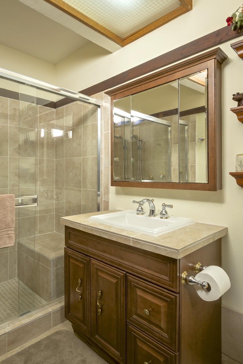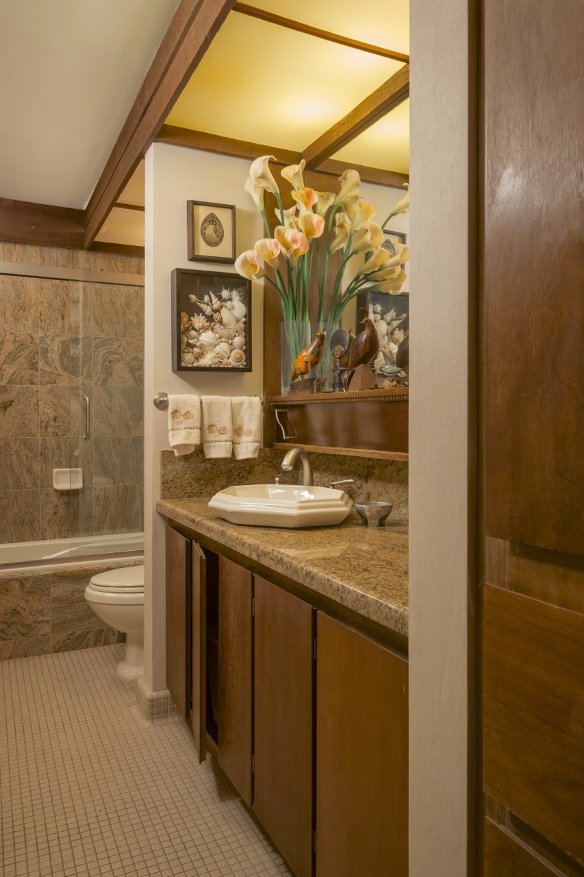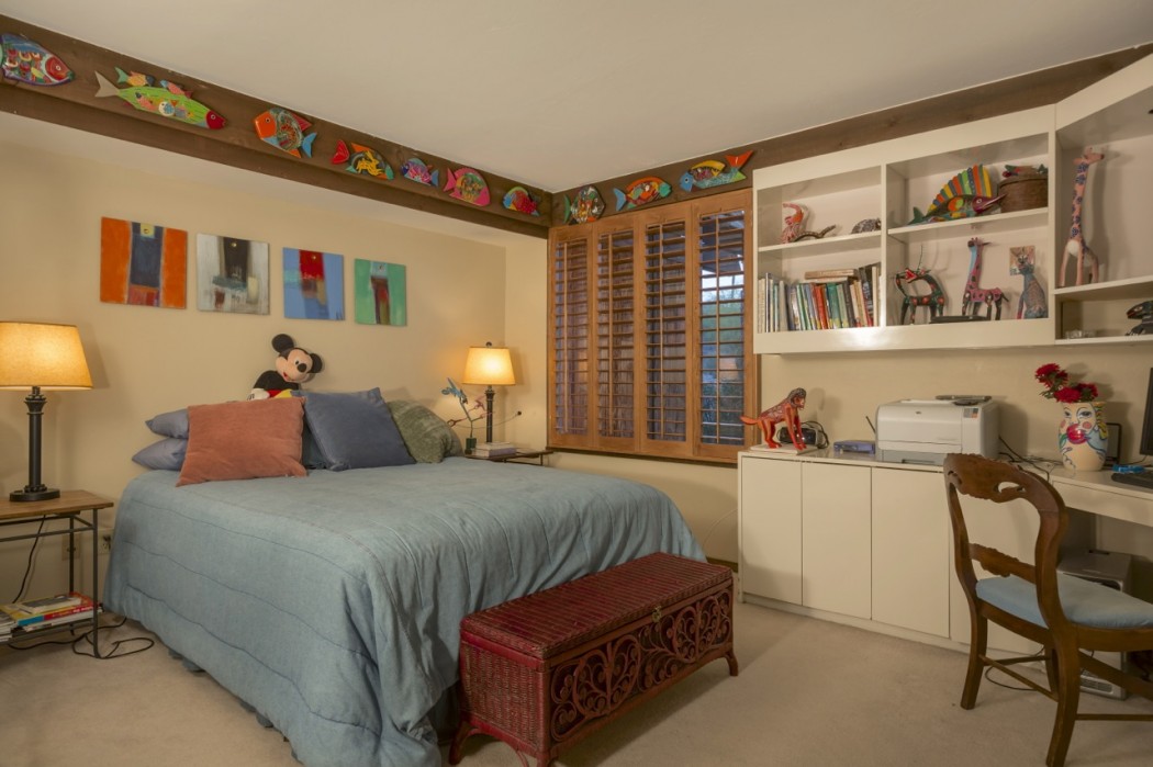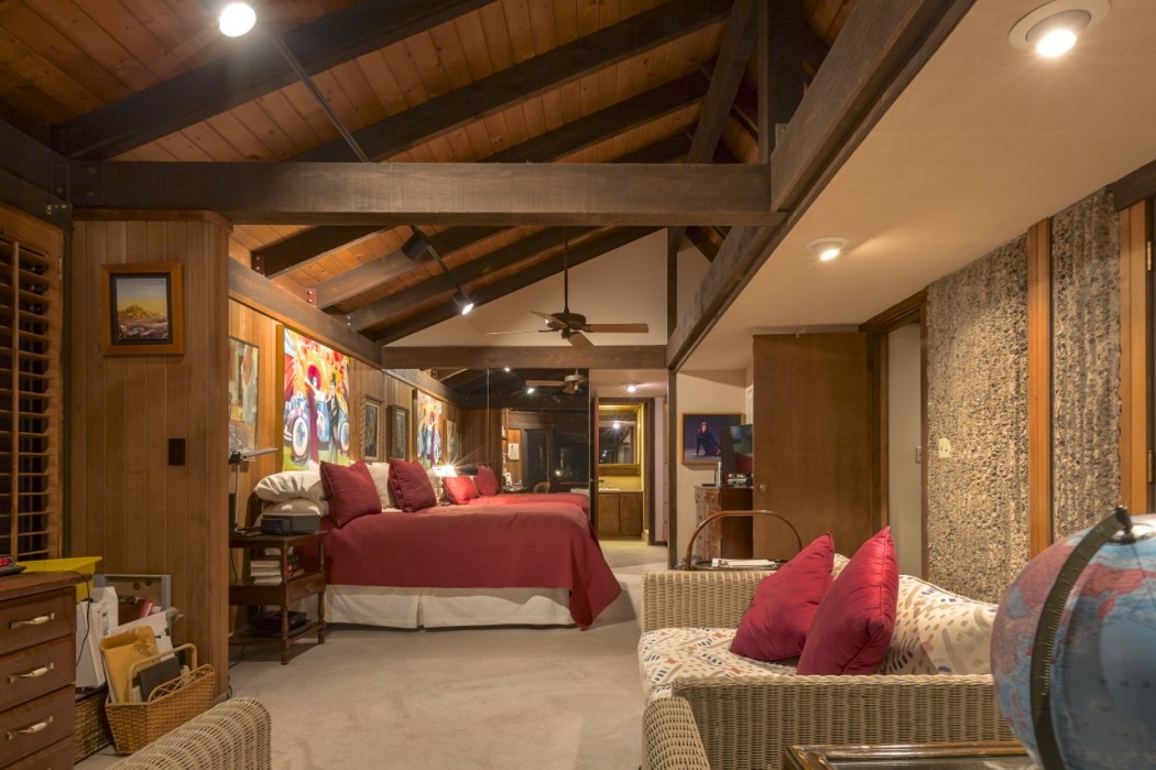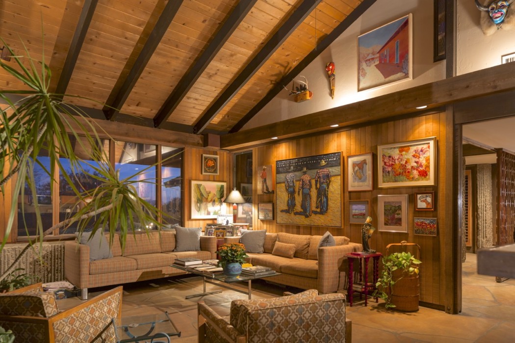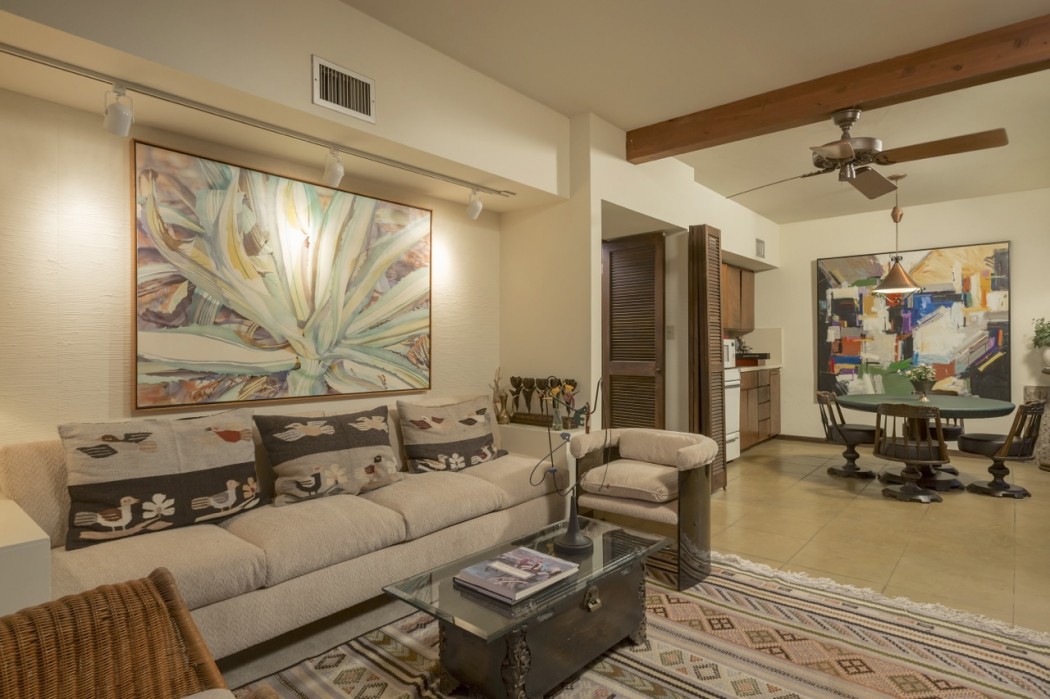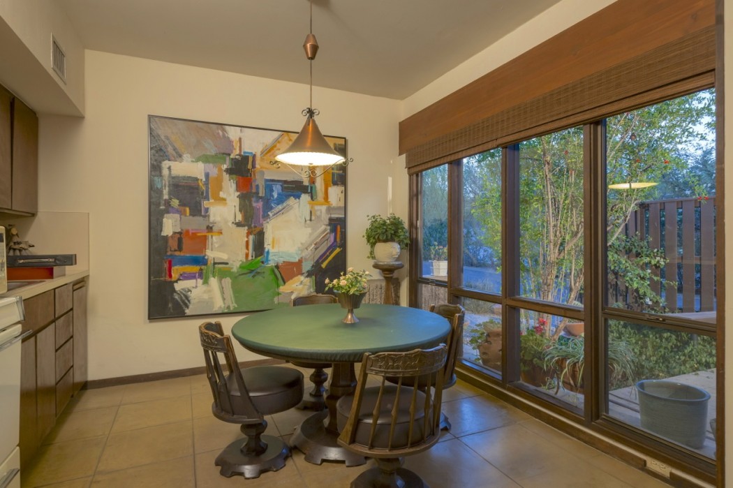 Vaulted ceilings and clerestory windows allow for a play of light throughout; flagstone and finished concrete floors provide natural warmth.  With three bedrooms plus attached guest suite, the property has a commanding view of Camelback Mountain as well city lights in the evening.   The pool and spa area includes an adjacent pergola and bath house and there’s three-car carport parking.