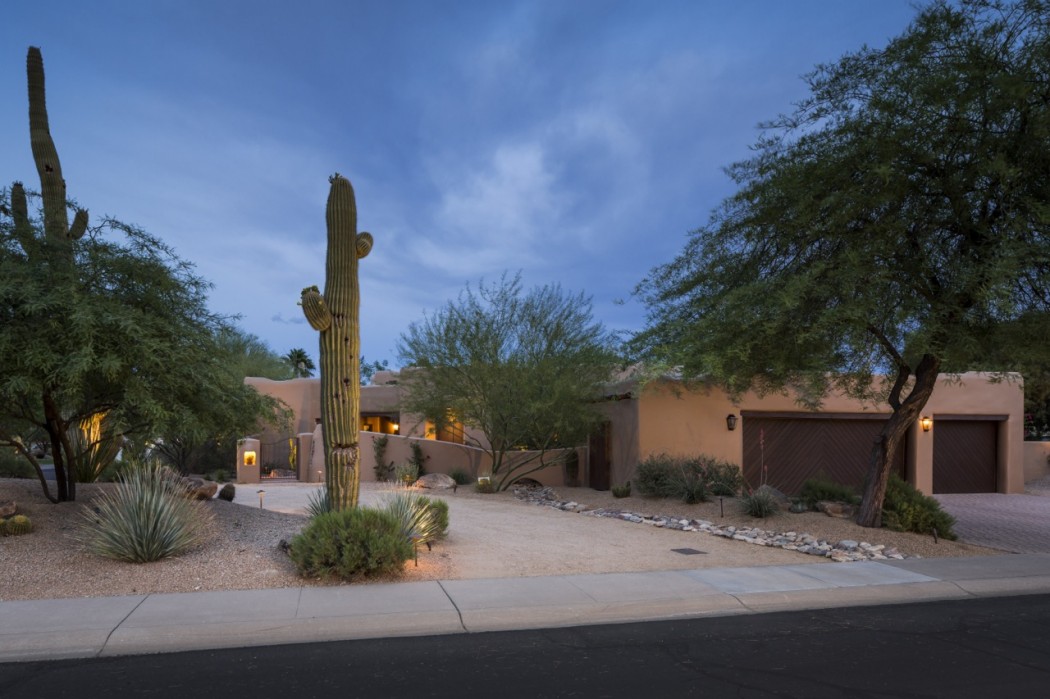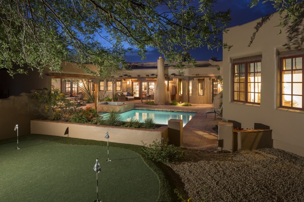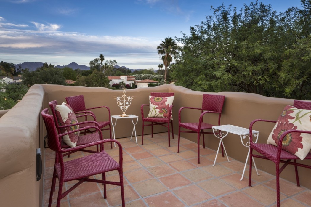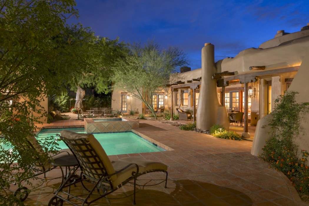 The drop-dead gorgeous kitchen is ready to cook with double ovens, 6-burner pro range and butler’s pantry; furniture grade cabinetry, custom cast concrete counters, hand-painted tiles and fireplace add authentic charm. The Main house offers three bedrooms plus den and there’s a full Guest House that’s a perfect retreat, studio or office. Enjoy sunsets on the roof top view deck or relax in the shade of the deep patios or cabana. Warm your desert nights with one of the five fireplaces or cool off in the pool and spa. Well published, this home is simply exquisite and irreplaceable at this price.