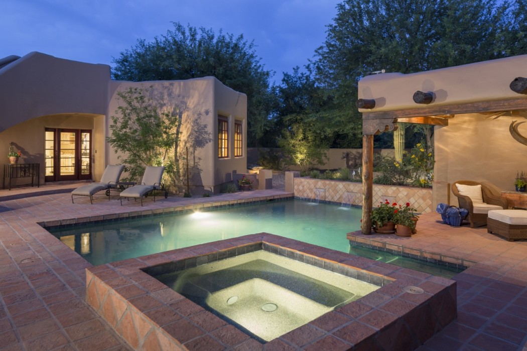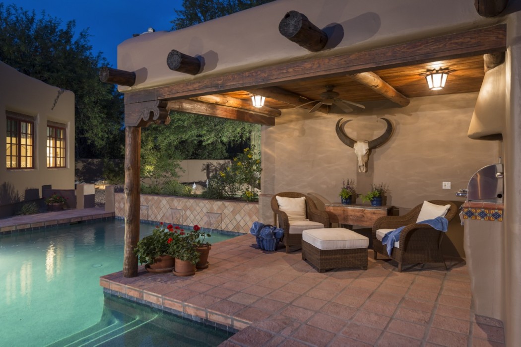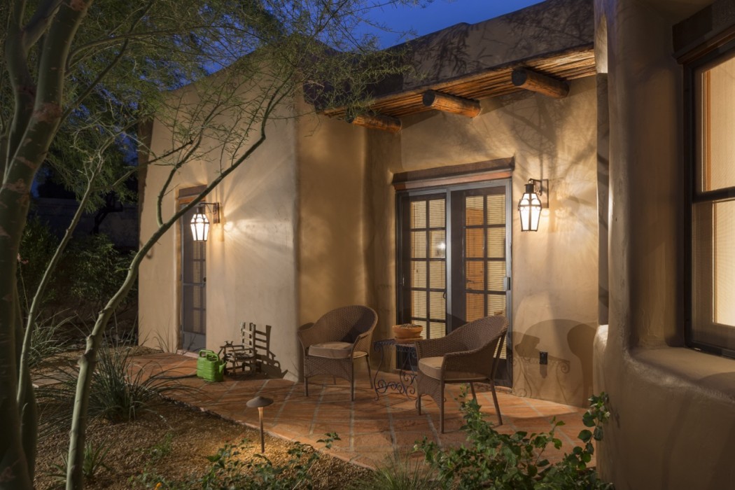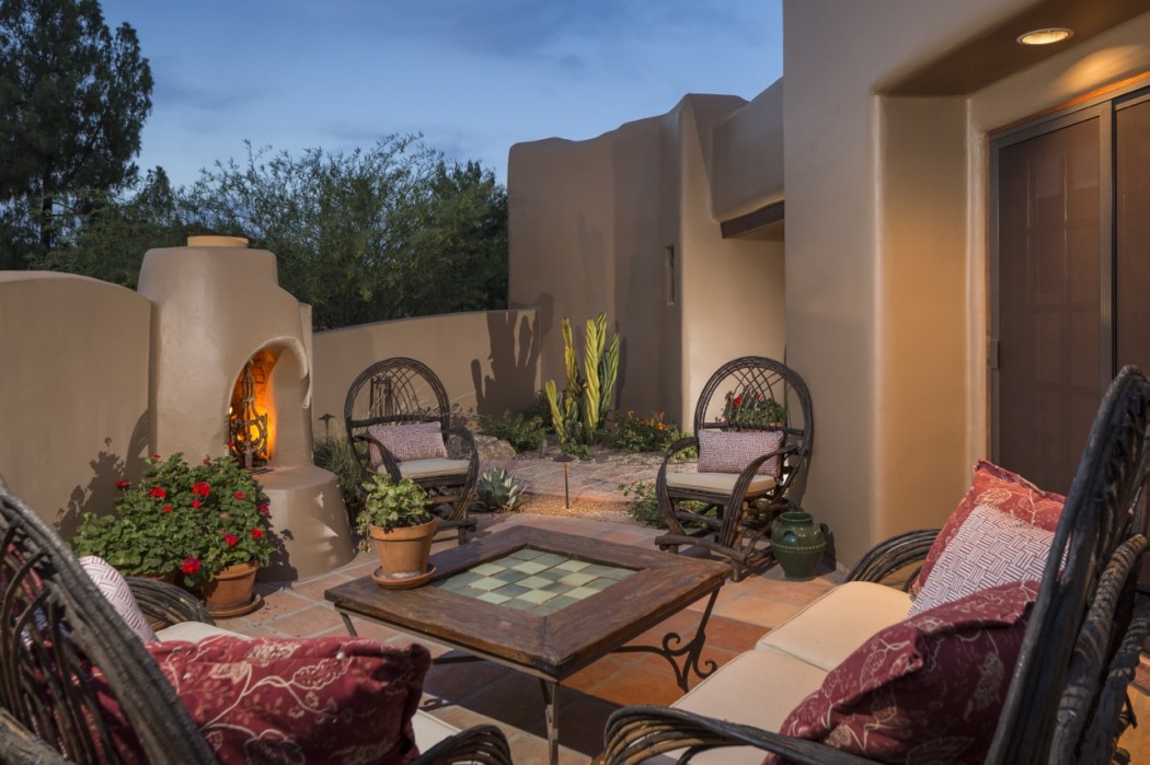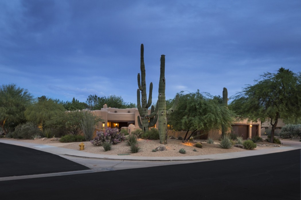 The drop-dead gorgeous kitchen is ready to cook with double ovens, 6-burner pro range and butler’s pantry; furniture grade cabinetry, custom cast concrete counters, hand-painted tiles and fireplace add authentic charm. The Main house offers three bedrooms plus den and there’s a full Guest House that’s a perfect retreat, studio or office. Enjoy sunsets on the roof top view deck or relax in the shade of the deep patios or cabana. Warm your desert nights with one of the five fireplaces or cool off in the pool and spa. Well published, this home is simply exquisite and irreplaceable at this price.