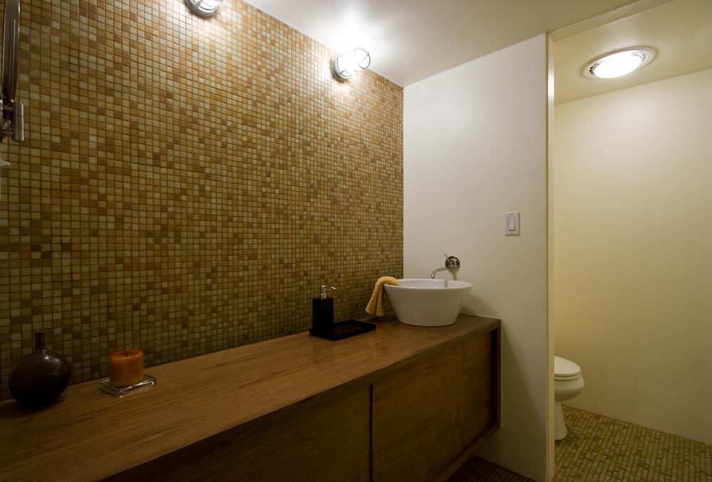 Mosaic flooring and wall in half bath