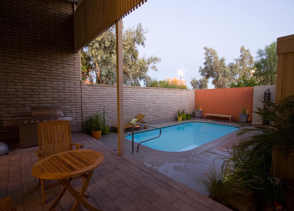 A rare find among mid-century modern design – a spacious 1964 townhome featuring a private pool, private garage, a catwalk connecting two spacious master suites and a 2-story wall of windows. Architect/owner has done a complete remodel including ground concrete floors on the first level, cork flooring on the second level, marble countertops in the kitchen, custom steel and Birch staircase, and three energy efficient sliding glass doors.