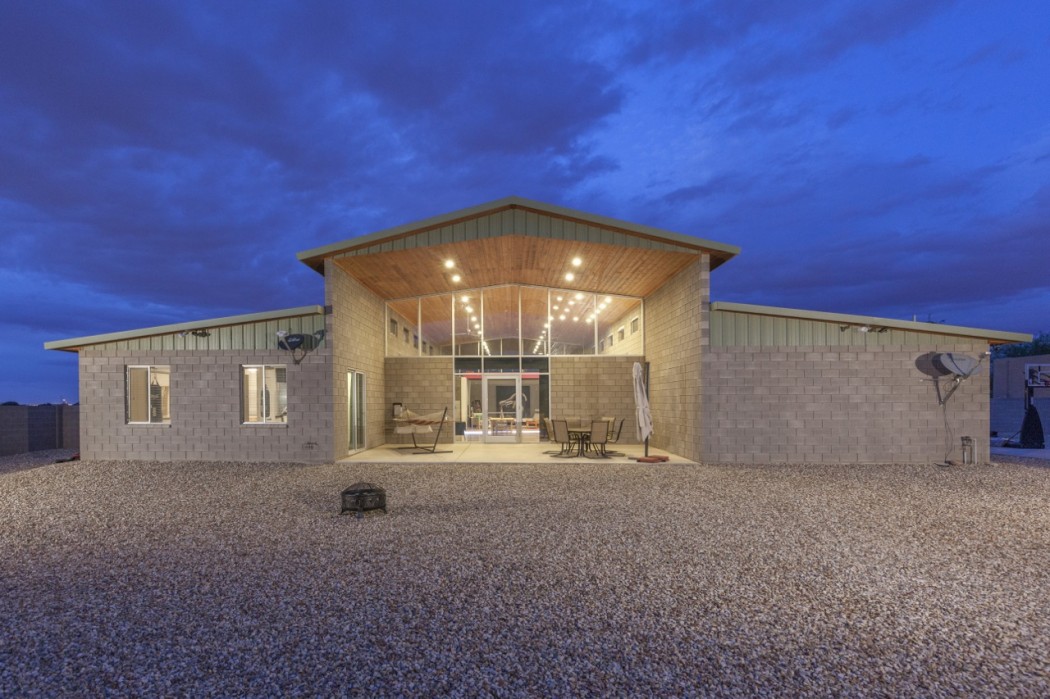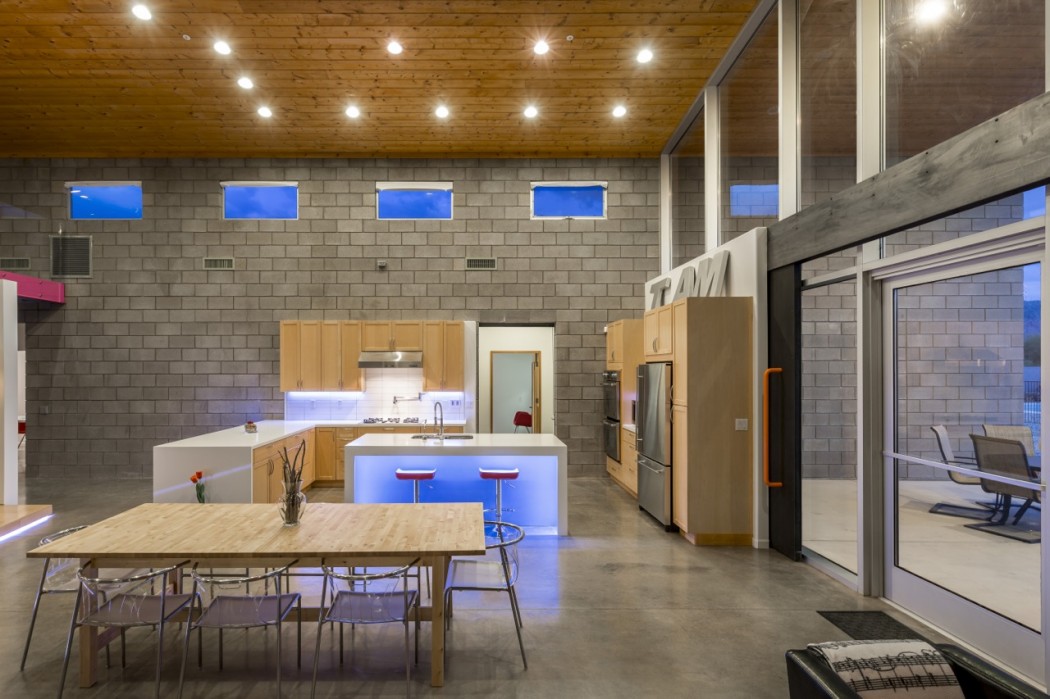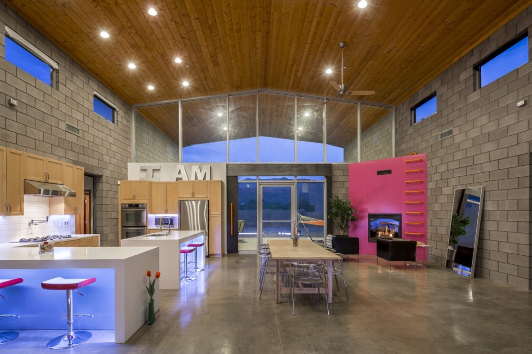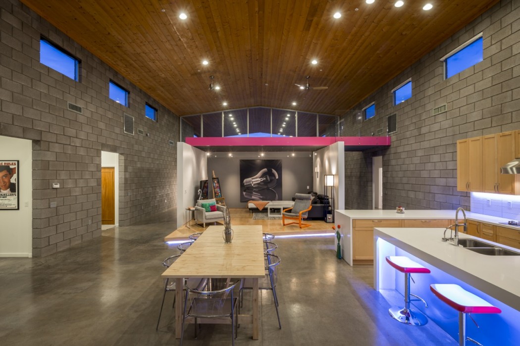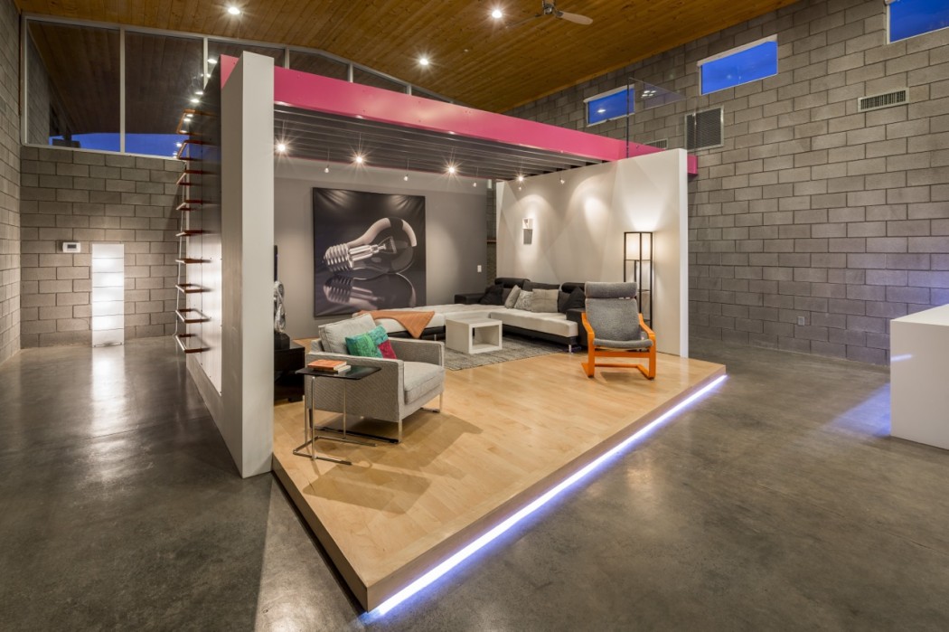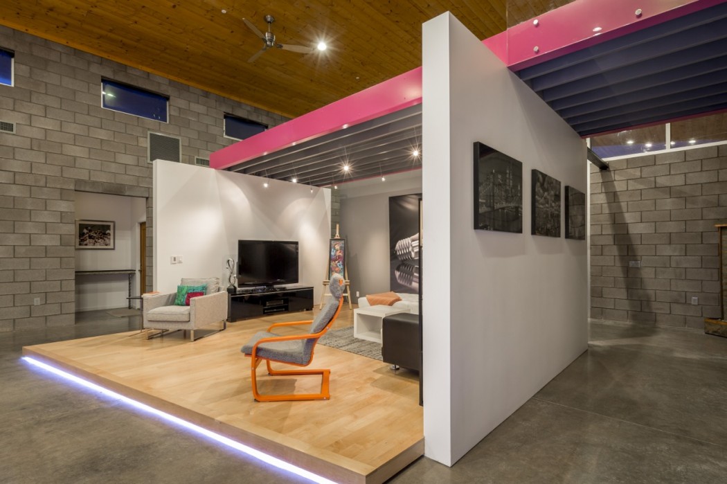 Designed to be secure, green, ultra-modern and playful, the great room has been redefined with the creation of an internal “stage for living” while the bathrooms and bedrooms remain personal retreats. The “ceiling” of the main space has perforated metal panels on top that diffuse natural light coming in from the surrounding clerestory windows. Climb on top of the structure via a built-in steel-tube ladder and you are rewarded with breathtaking views of the growing Phoenix skyline and mountain sunsets. Color-changing LED lights make the living room appear to float above the concrete floor.