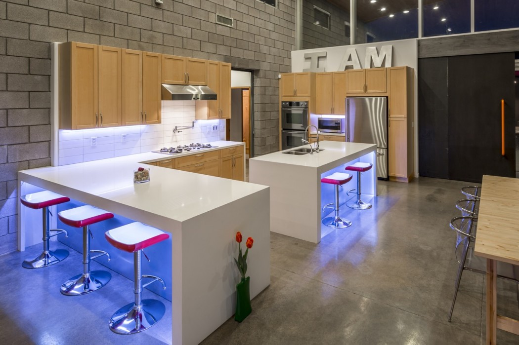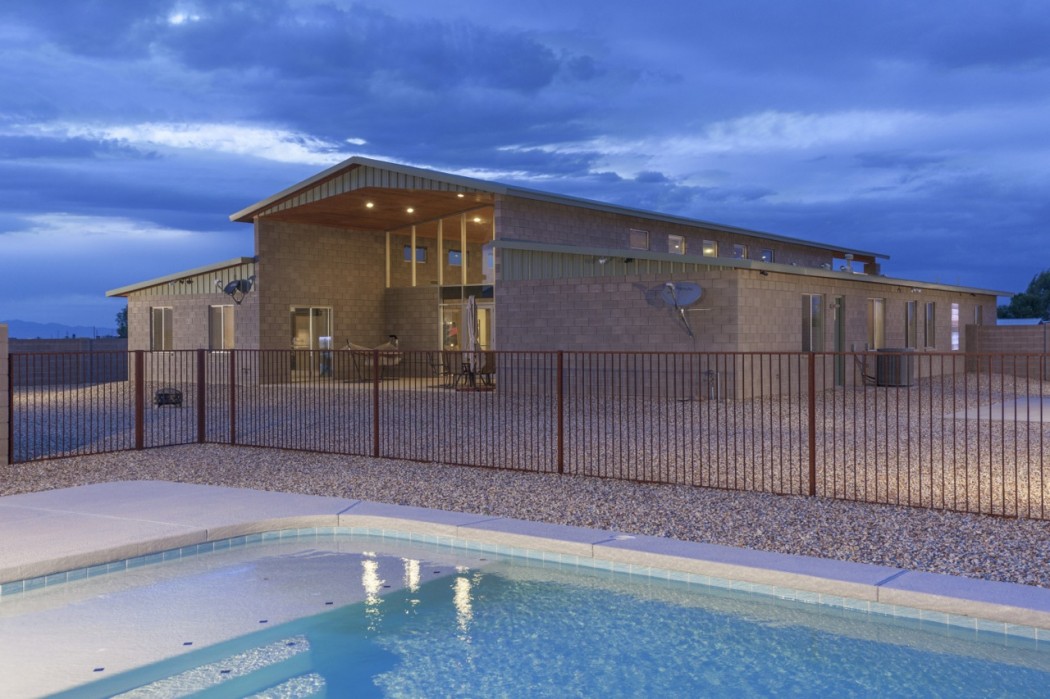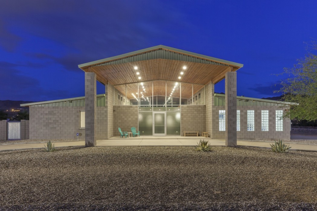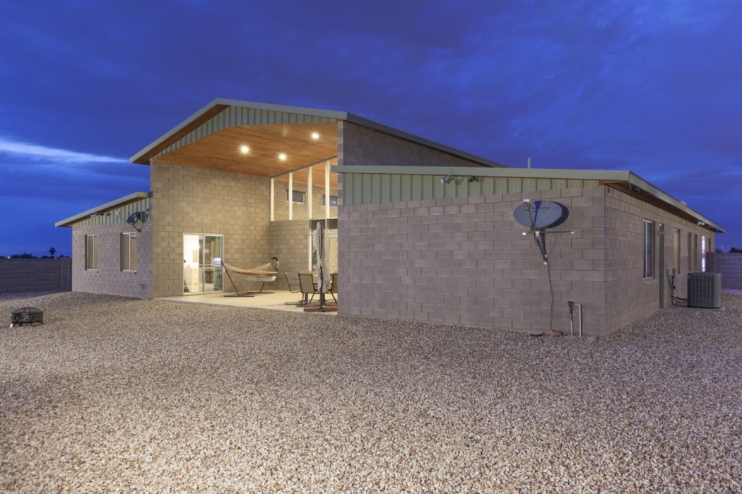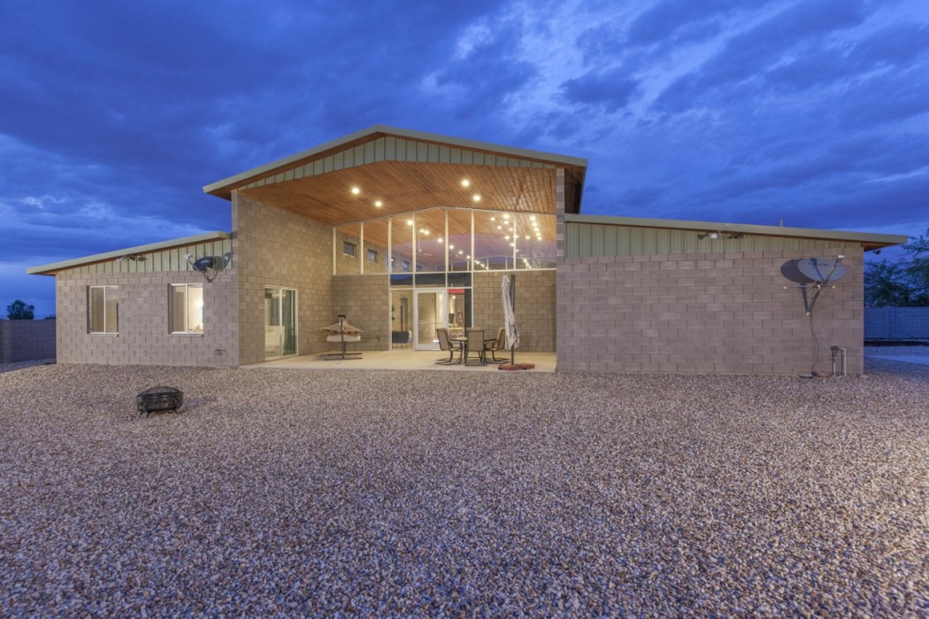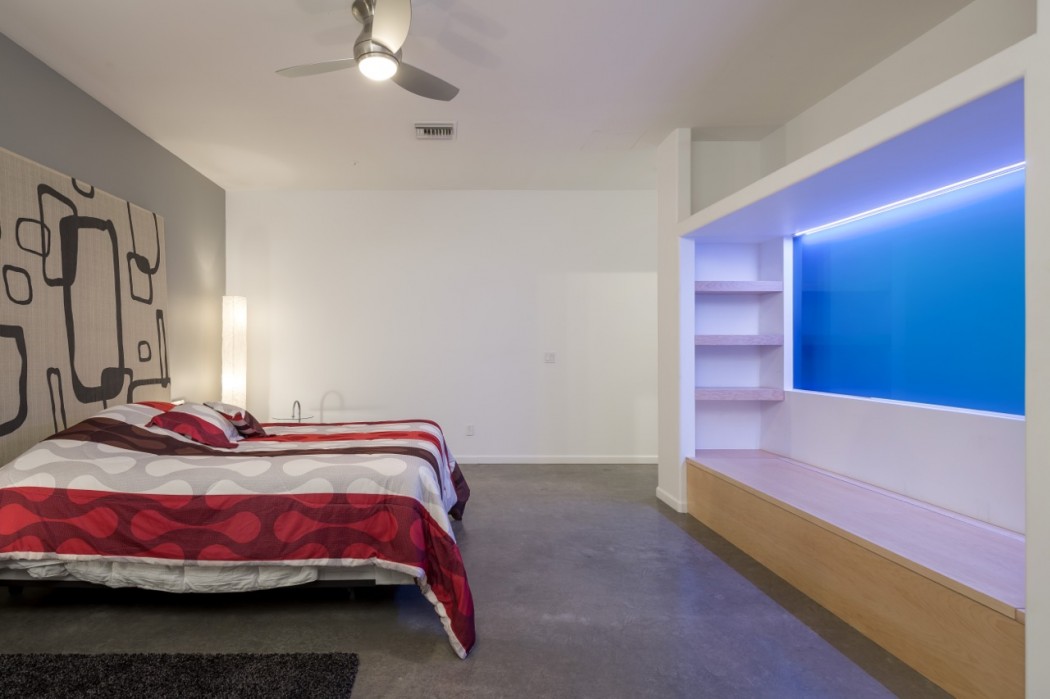 Designed to be secure, green, ultra-modern and playful, the great room has been redefined with the creation of an internal “stage for living” while the bathrooms and bedrooms remain personal retreats. The “ceiling” of the main space has perforated metal panels on top that diffuse natural light coming in from the surrounding clerestory windows. Climb on top of the structure via a built-in steel-tube ladder and you are rewarded with breathtaking views of the growing Phoenix skyline and mountain sunsets. Color-changing LED lights make the living room appear to float above the concrete floor.