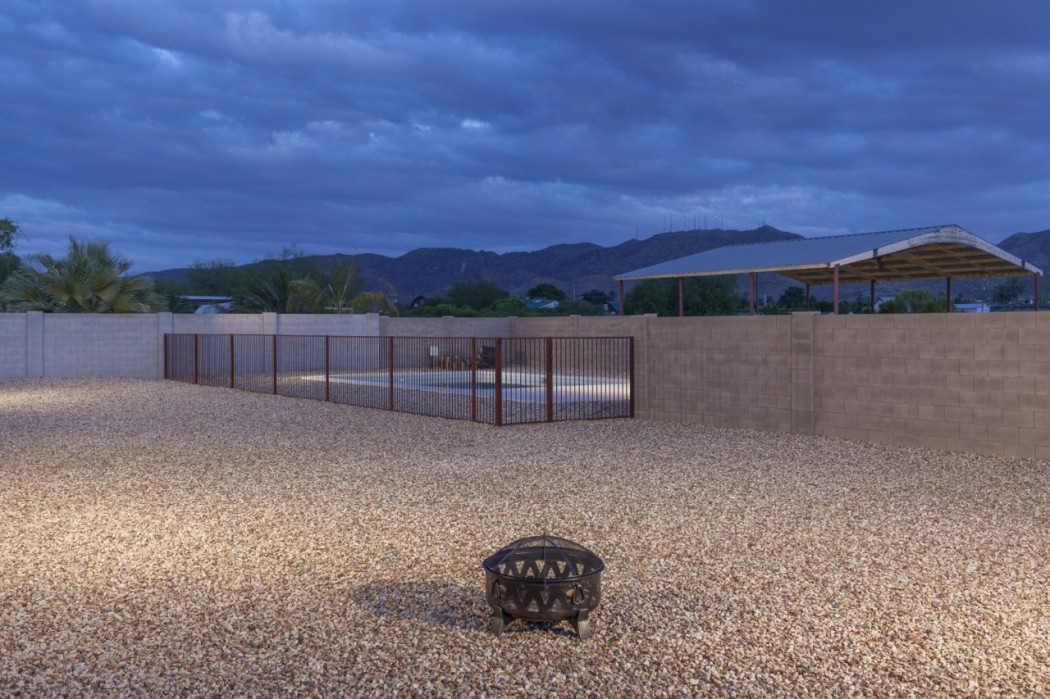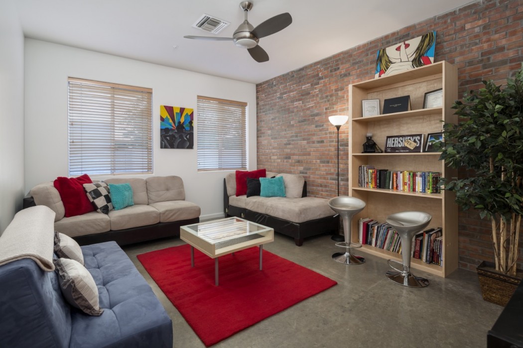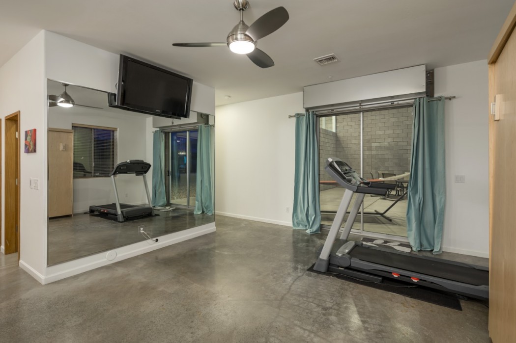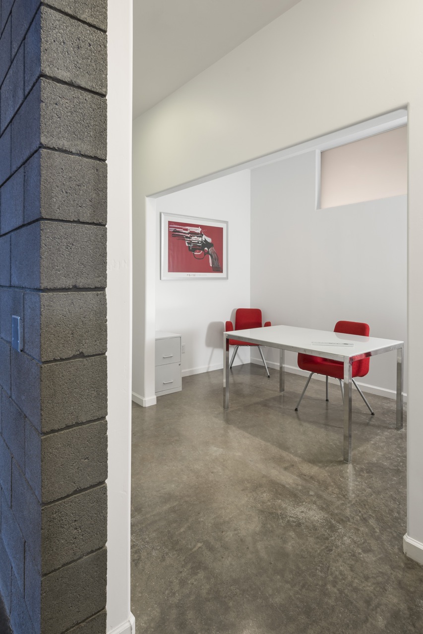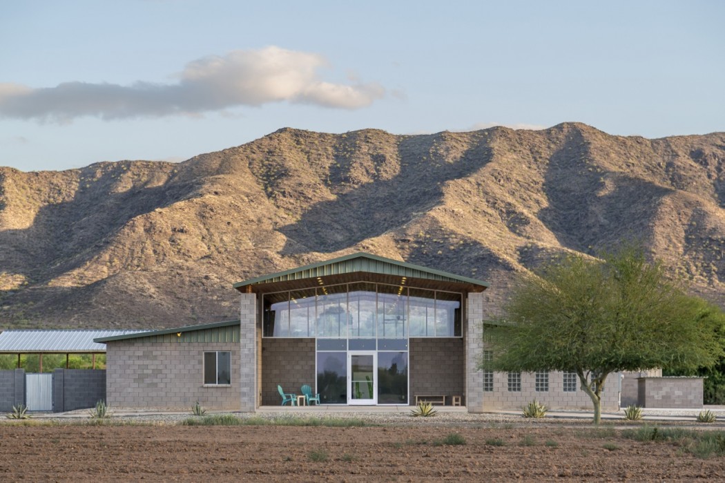 Designed to be secure, green, ultra-modern and playful, the great room has been redefined with the creation of an internal “stage for living” while the bathrooms and bedrooms remain personal retreats. The “ceiling” of the main space has perforated metal panels on top that diffuse natural light coming in from the surrounding clerestory windows. Climb on top of the structure via a built-in steel-tube ladder and you are rewarded with breathtaking views of the growing Phoenix skyline and mountain sunsets. Color-changing LED lights make the living room appear to float above the concrete floor.