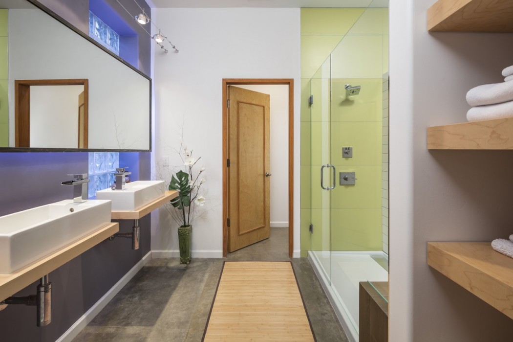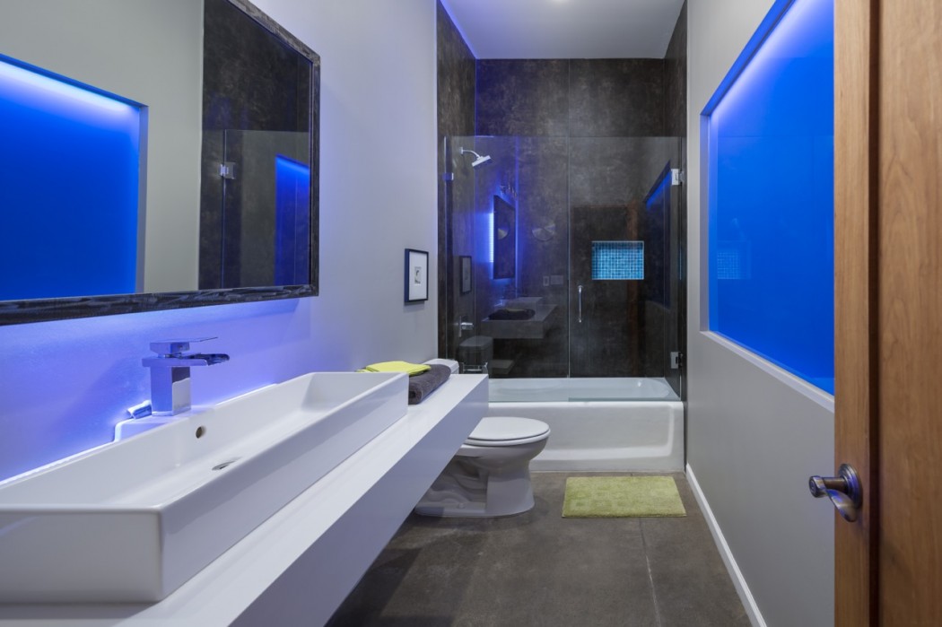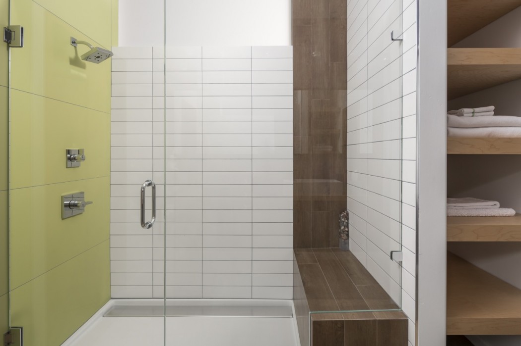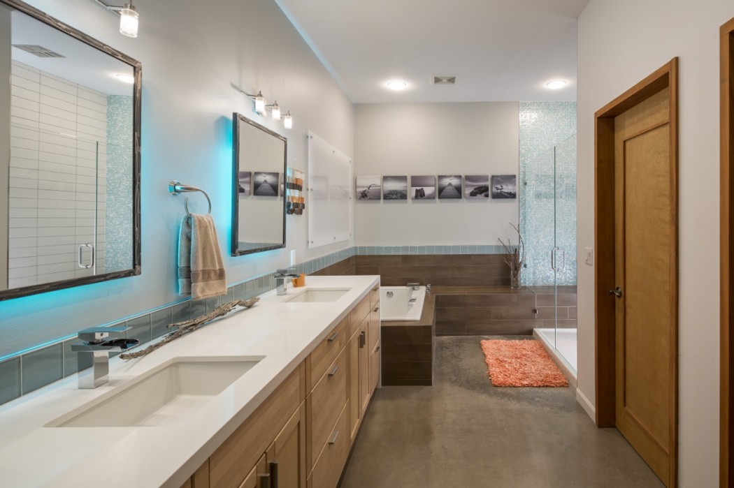 The home offers a spa-like feel that is also super-durable and low maintenance. The Master shower has vertical soft blue mosaic accents that carry the eye up to the tall ceilings. Porcelain wood finish tile clads the tub surround and extend into the shower to become a bench. Color-changing LED lighting highlights all the neutral colors of a space to reflect the homeowners’ moods.