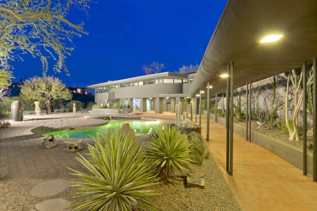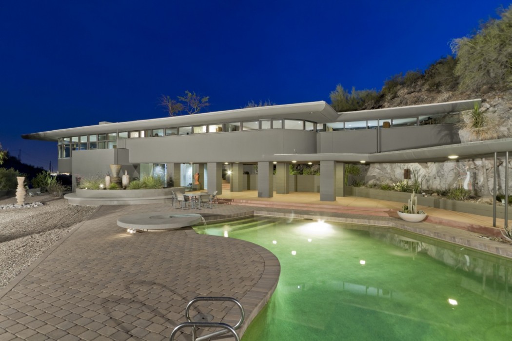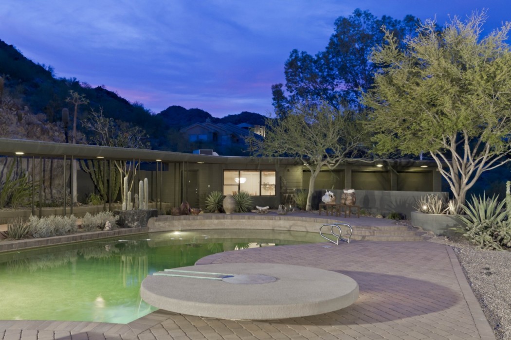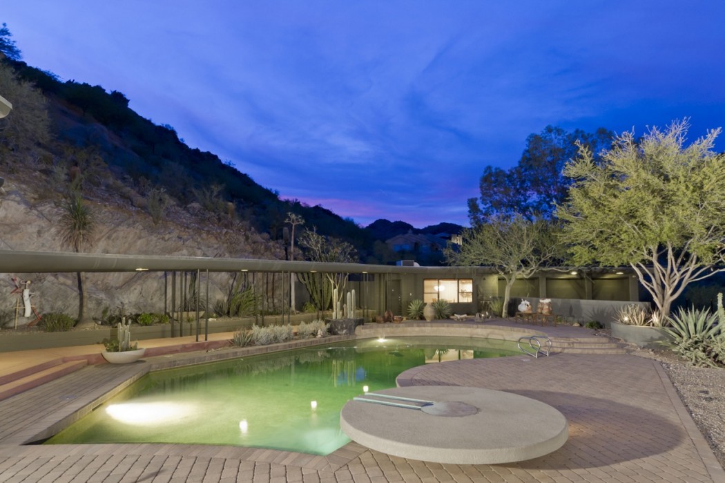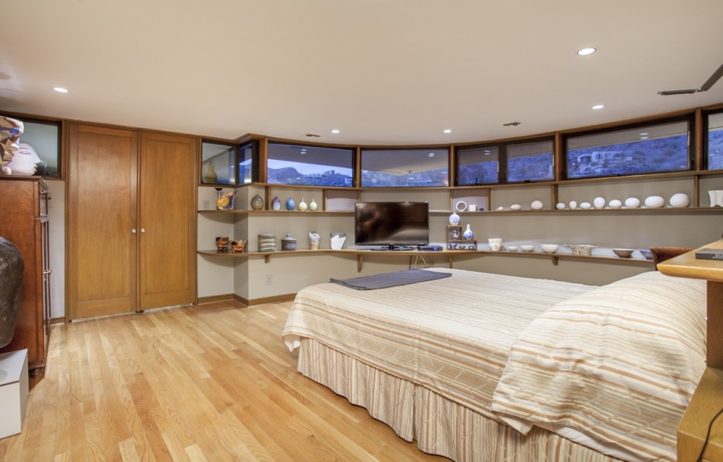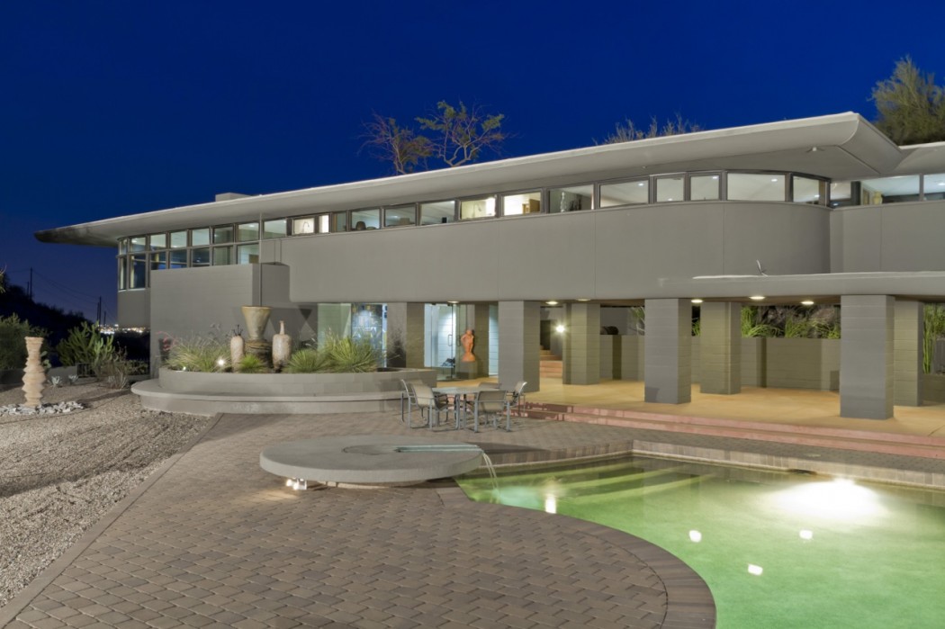 Site entry is through a secured and gated drive up to the three-car garage, guest house and motor court. A gracious pergola walkway directs you to the home and entry loggia. The ground floor offers a bonus room, media, bar and powder room. The main level showcases a stunning curved living room, formal dining, signature Wright/Taliesin inspired fireplace, and large workspace/kitchen with stainless steel counters. Follow the Gallery back to the open den bedroom, guest room, bath and into the master suite which includes dressing room/bath and walk-in closet. A wealth of original and restored mahogany cabinetry, bookcases and millwork have been retained.The home offers original oak floors and updated windows and doors. There is a pebble finish dramatic pool and water feature. The Landscape Design, including revised garden court patio was by award-winning Landscape Architect Steve Martino. All exterior sculpture, artwork and entry art tile wall does not convey.