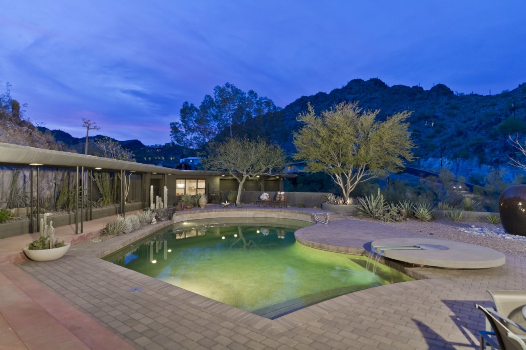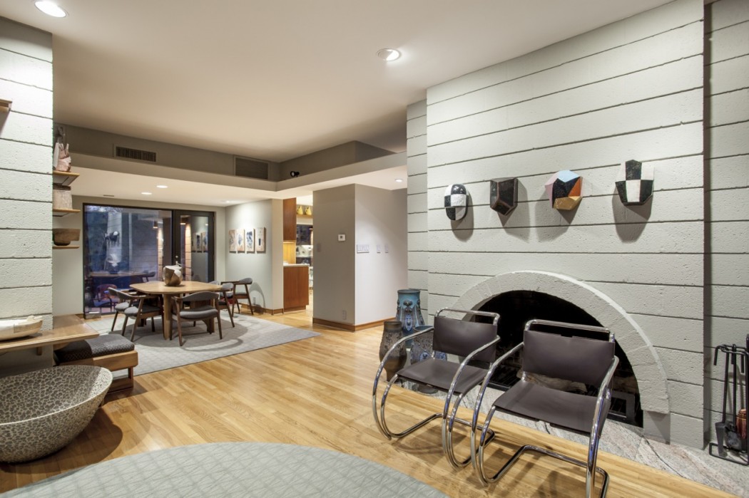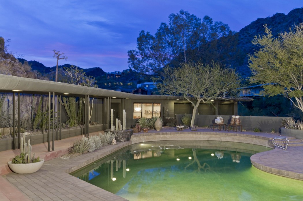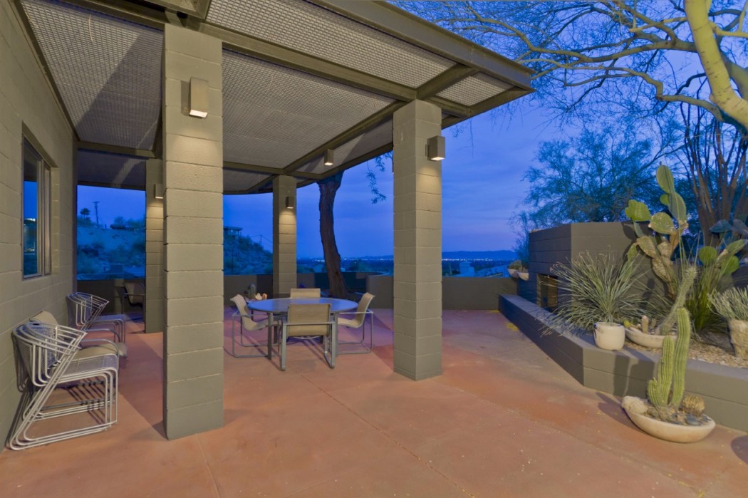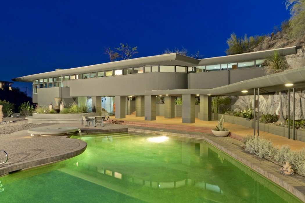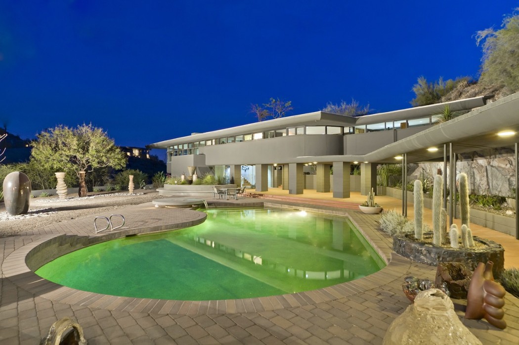 Site entry is through a secured and gated drive up to the three-car garage, guest house and motor court. A gracious pergola walkway directs you to the home and entry loggia. The ground floor offers a bonus room, media, bar and powder room. The main level showcases a stunning curved living room, formal dining, signature Wright/Taliesin inspired fireplace, and large workspace/kitchen with stainless steel counters. Follow the Gallery back to the open den bedroom, guest room, bath and into the master suite which includes dressing room/bath and walk-in closet. A wealth of original and restored mahogany cabinetry, bookcases and millwork have been retained.The home offers original oak floors and updated windows and doors. There is a pebble finish dramatic pool and water feature. The Landscape Design, including revised garden court patio was by award-winning Landscape Architect Steve Martino. All exterior sculpture, artwork and entry art tile wall does not convey.